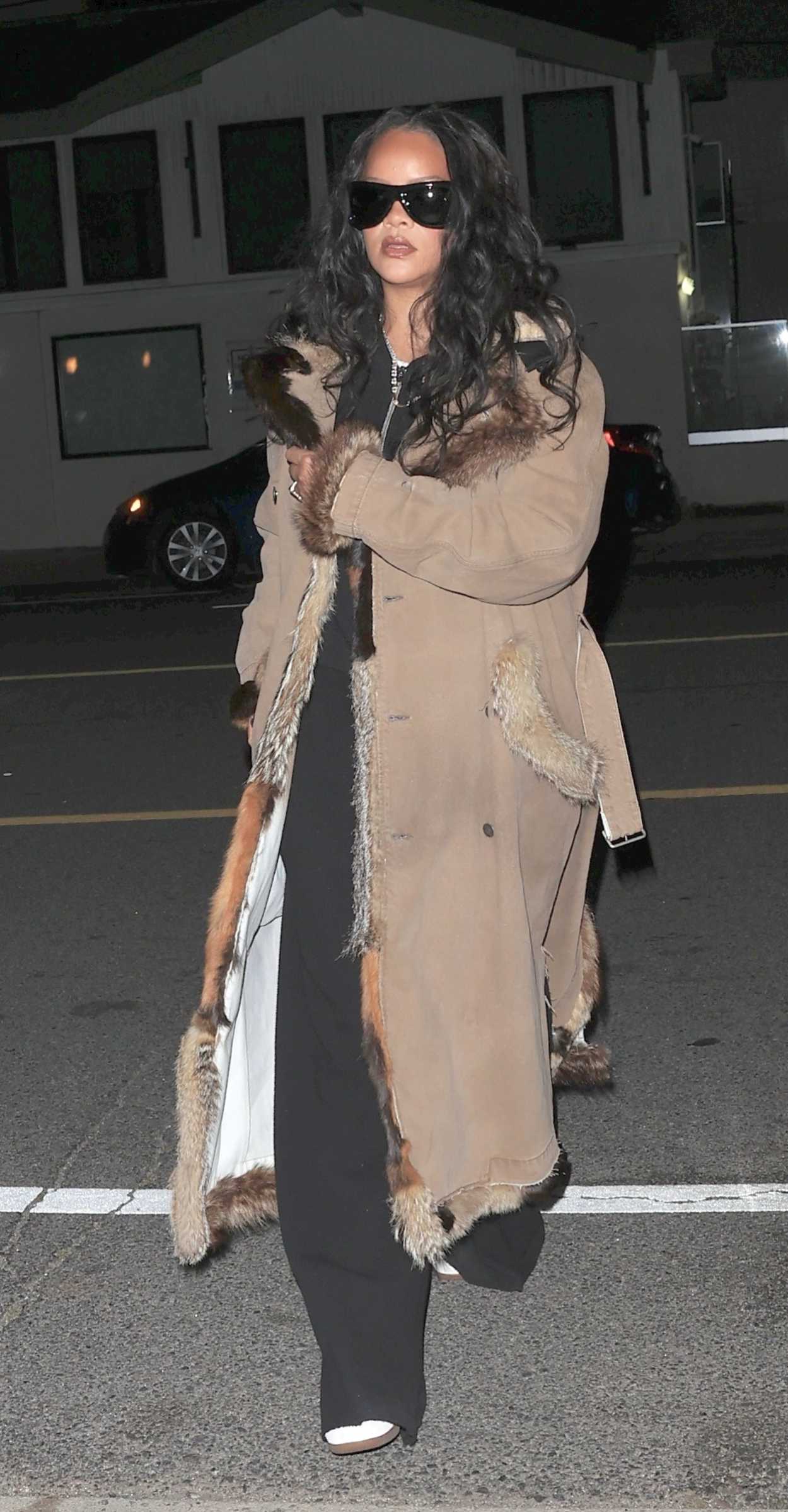 The 38-year-old R&B singer Rihanna in a tan coat steps out for a late night dinner at Giorgio Baldi in Santa Monica.