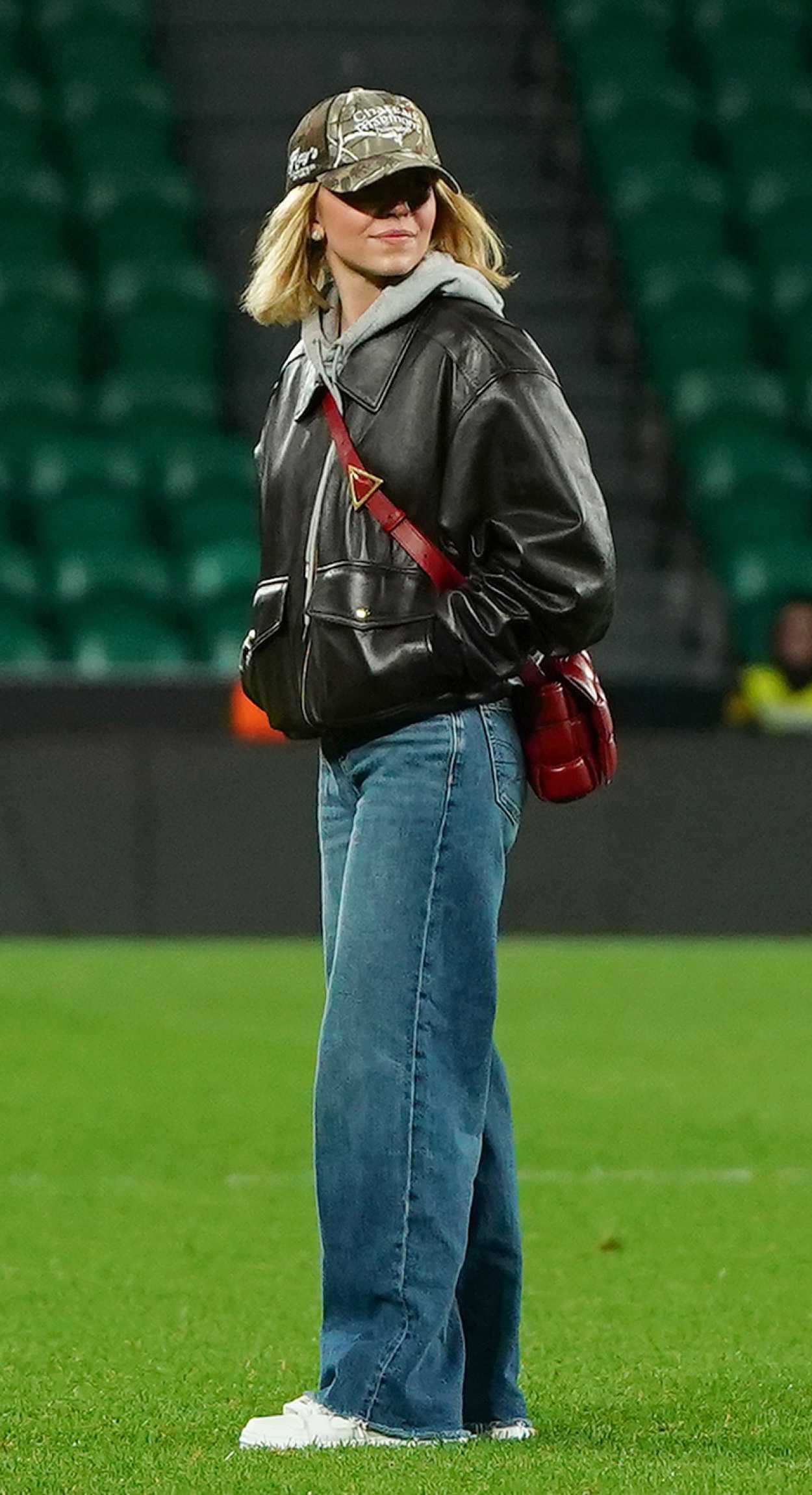 The 28-year-old actress Sydney Sweeney, who won Best Actress honors for her role in “Takeo” at the New York International Film Festival, in a black leather jacket attends Sporting CP v GD Estoril Praia at Estadio Jose Alvalade in Lisbon.