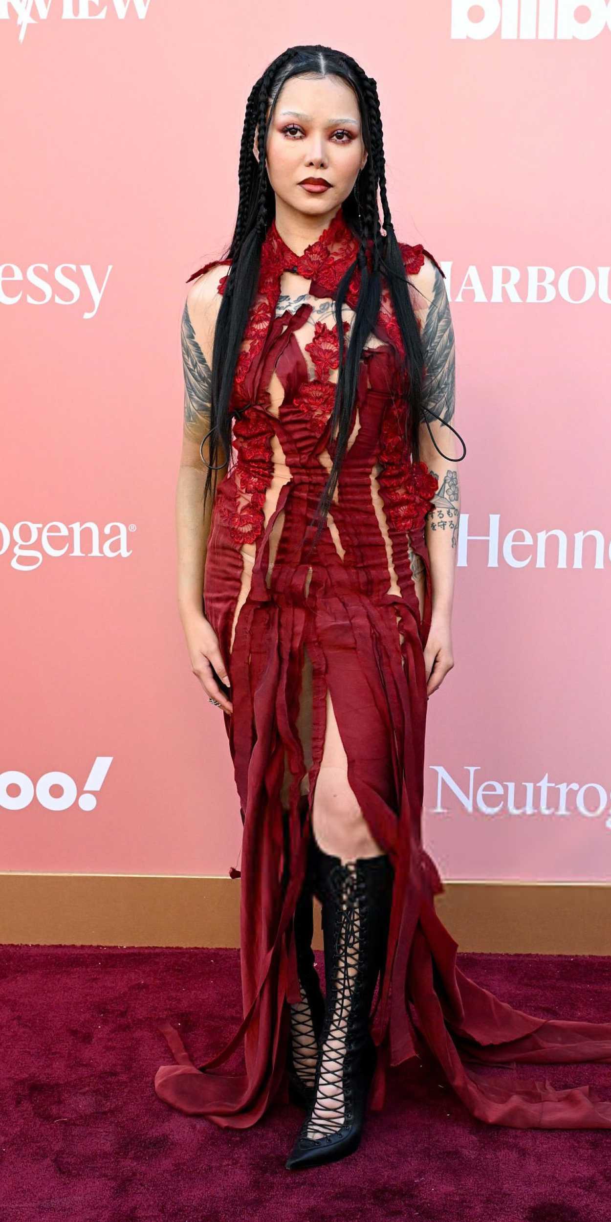 The 26-year-old country music singer and social media personality Ella Langley attends American Eagle Jeans Country at Stagecoach 2026 in Indio.