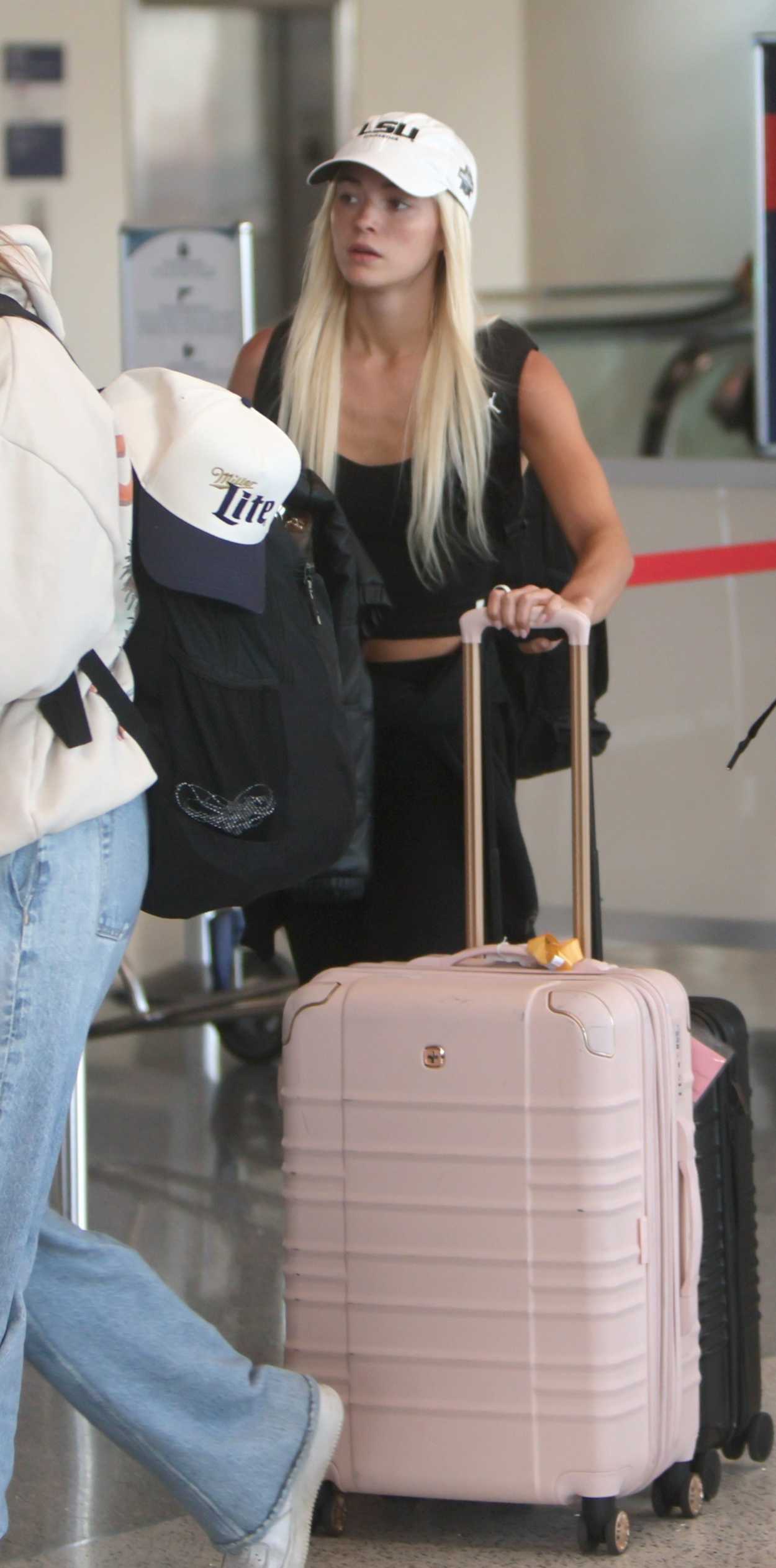 The 23-year-old gymnast Olivia Dunne in a black top catching a flight out of LAX Airport in Los Angeles.