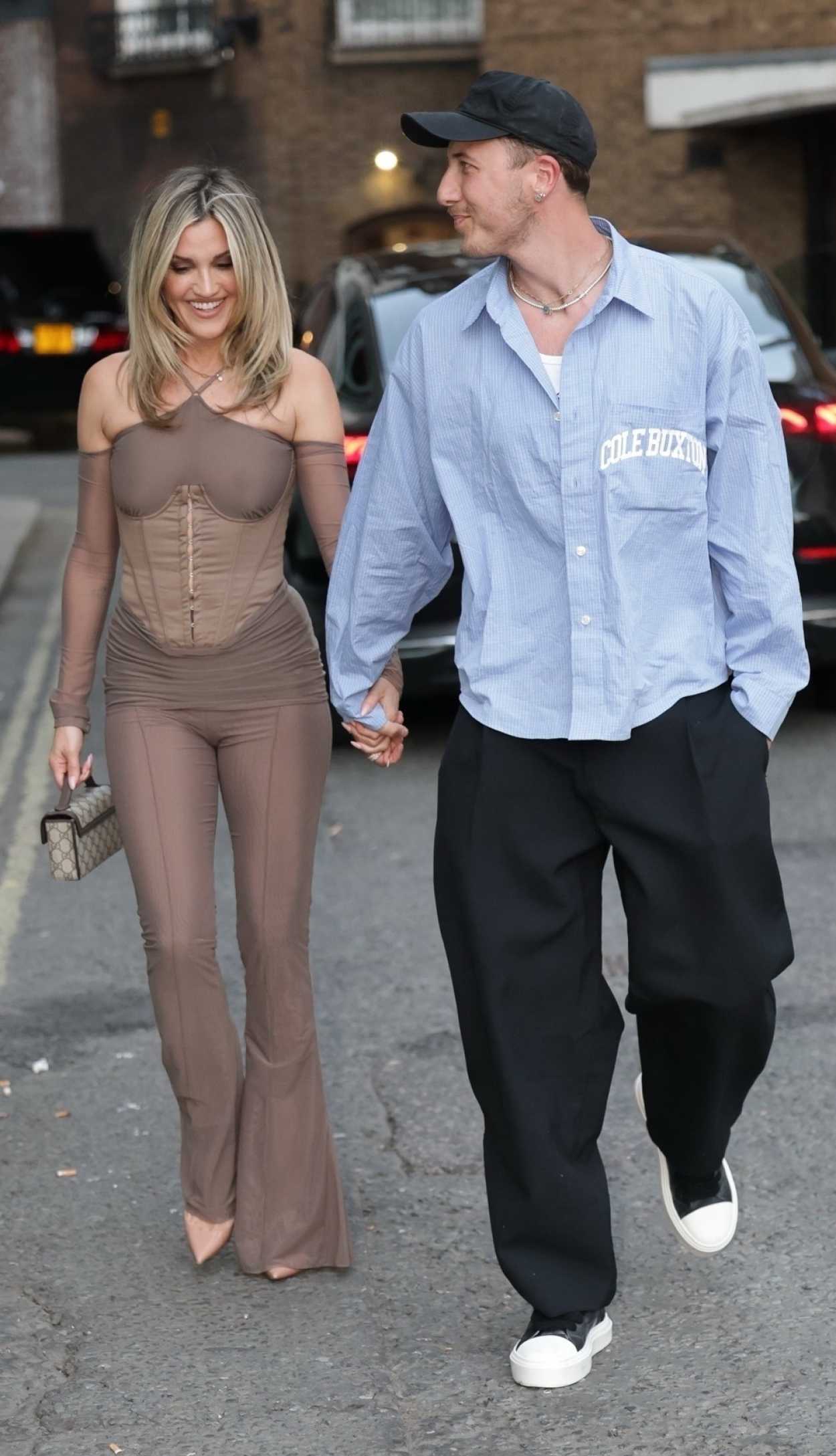 The 43-year-old pop singer Ashley Roberts, who in 2010 served as a judge on the show “Dancing on Ice”, in a beige see-through ensemble arrives at Sexy Fish with her boyfriend George Rollinson in Mayfair in London.