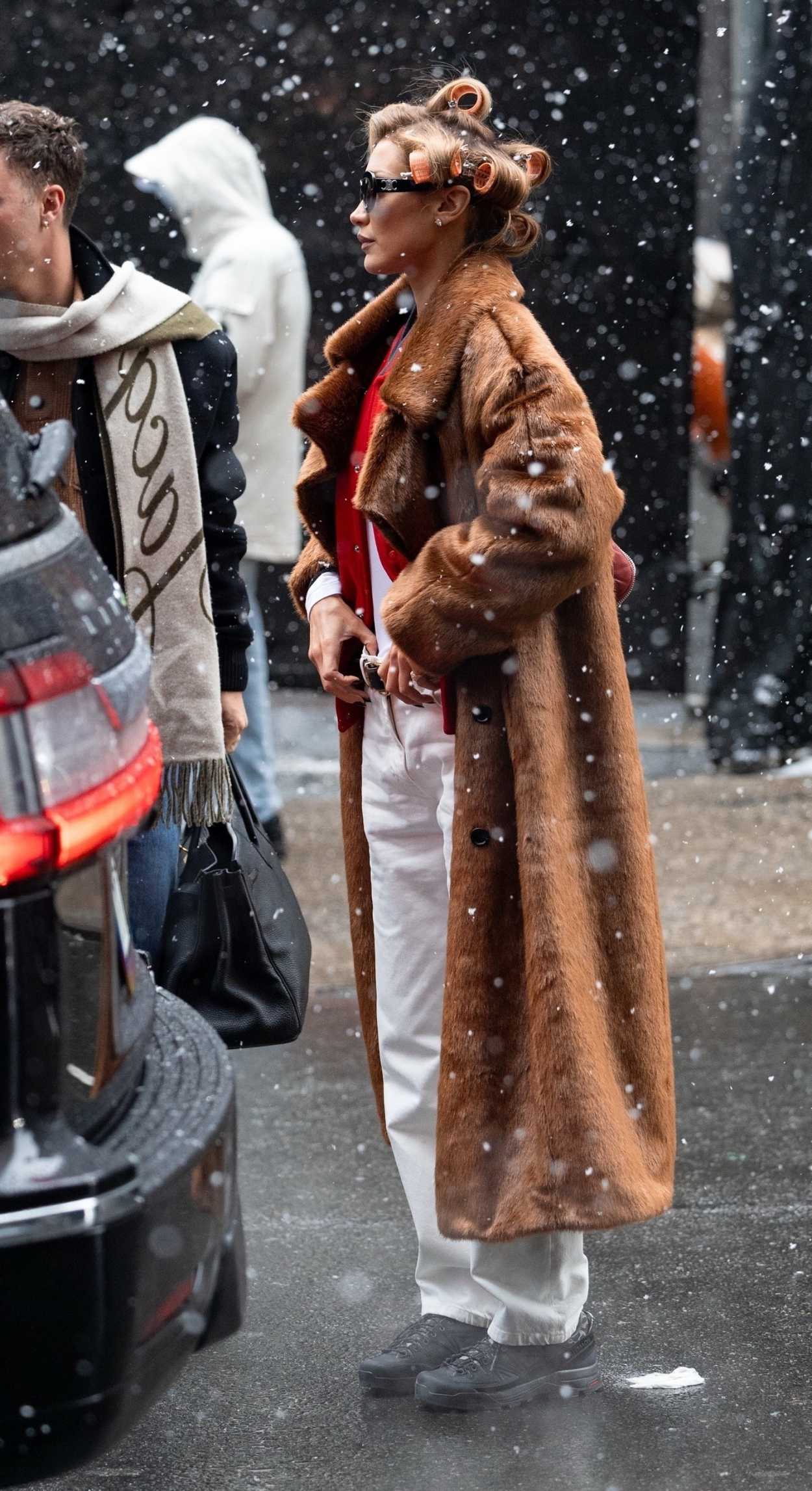The 29-year-old Supermodel Bella Hadid in a tan fur coat arrives at a photoshoot in New York City.