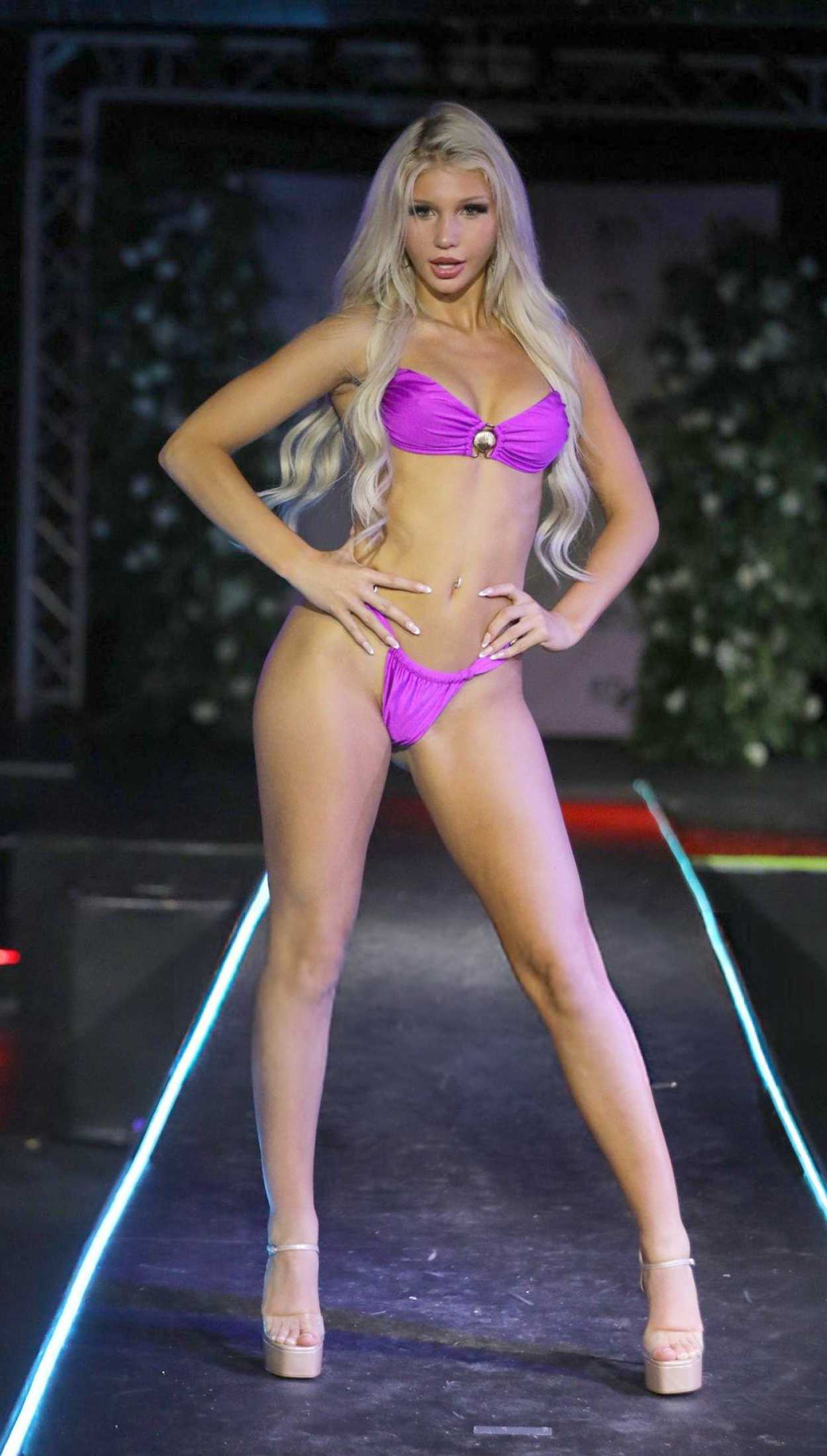 The 16-year-old Instagram star Brooklyn Riley, known for modeling and fashion content, in a lilac bikini walks for Golden Rose during the ATLSW runway show “Tulum After Dark” at Westside Cultural Arts Center in Atlanta.