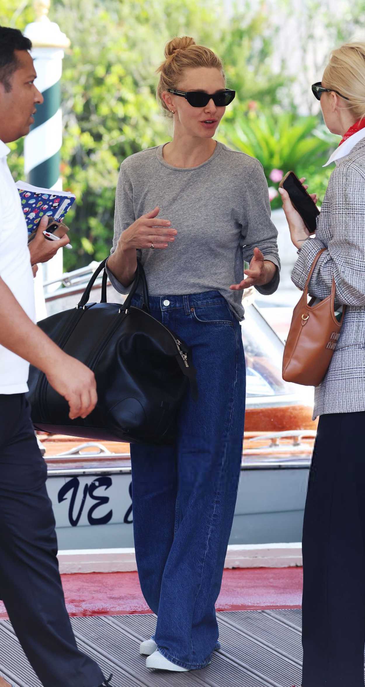 Amanda Seyfried in a Grey Long Sleeves T-Shirt Departs from Hotel Excelsior During the 82nd Venice International Film Festival in Venice 09/03/2025
