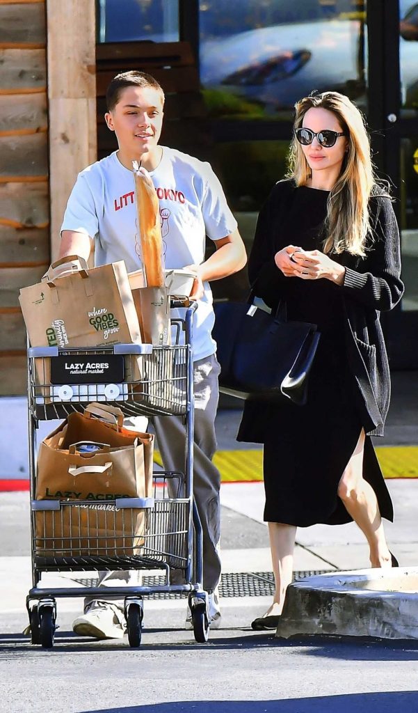 The 49-year-old actress Angelina Jolie in a black cardigan leaves Lazy Acres with her Son Knox in Los Angeles.