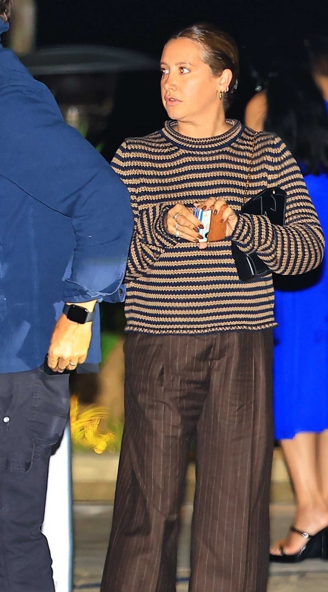 The 40-year-old actress Ashley Tisdale, who married Christopher French on September 8, 2014, in a brown pinstriped pants was seen out at Nobu in Malibu.