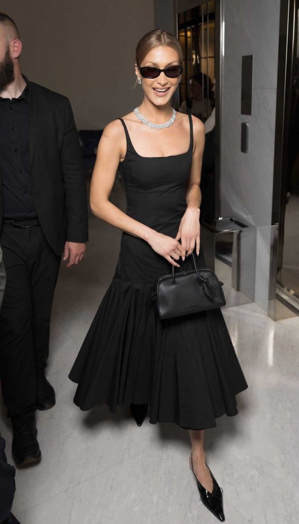The 28-year-old Supermodel Bella Hadid in a black dress arrives for Chopard presentation at Hotel Martinez in Cannes.