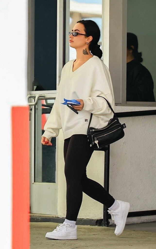 Demi Lovato in a White Nike Sneakers Makes Her Way Through a Parking Lot in Beverly Hills 04/23/2025
