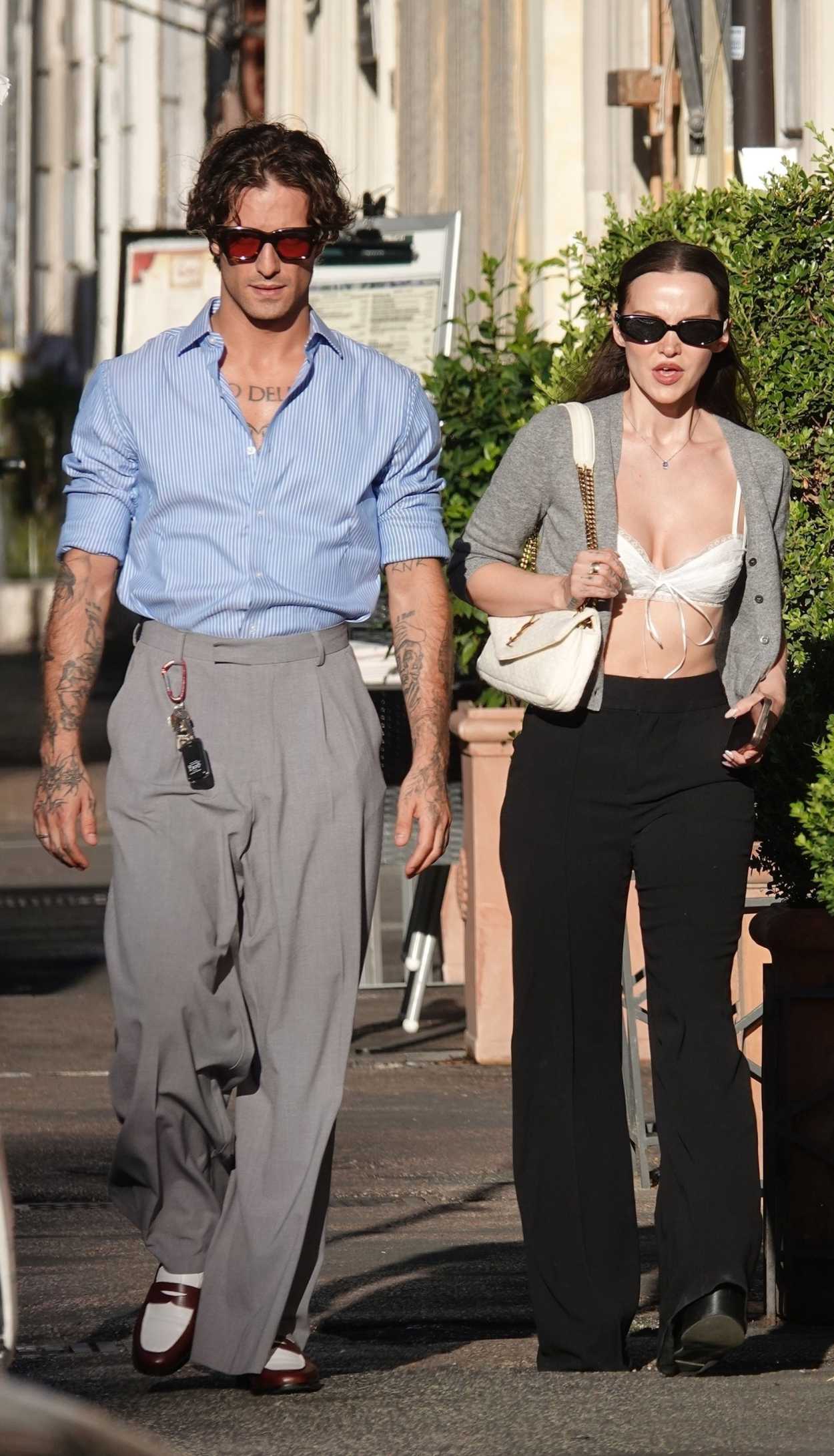 The 29-year-old American actress Dove Cameron in a grey pantsuit was seen out with Damiano David in New York.