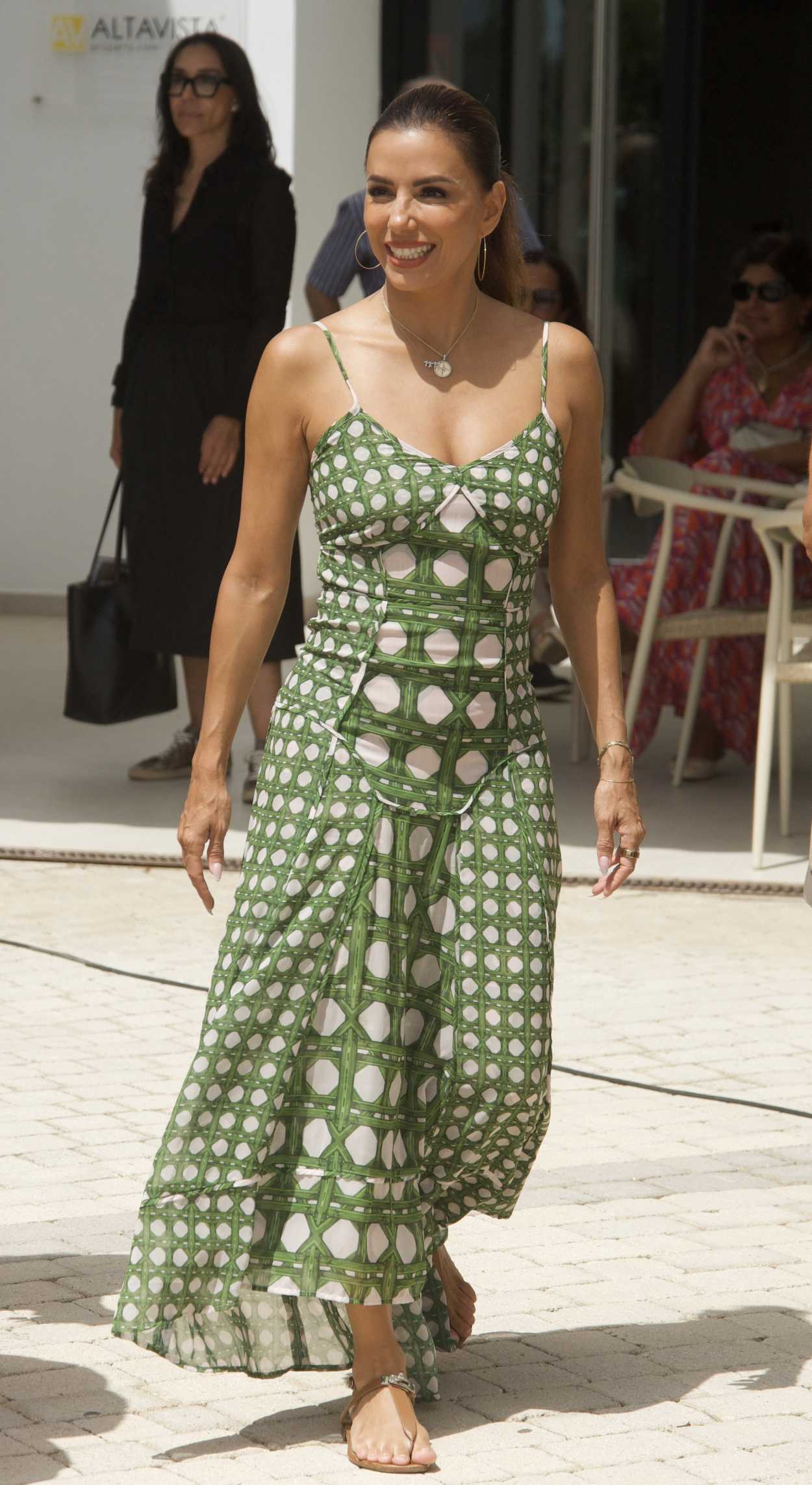 The 50-year-old actress Eva Longoria in a green dress attends at the inauguration of a monolith for Maria Bravo at Casa Angeles in Marbella.