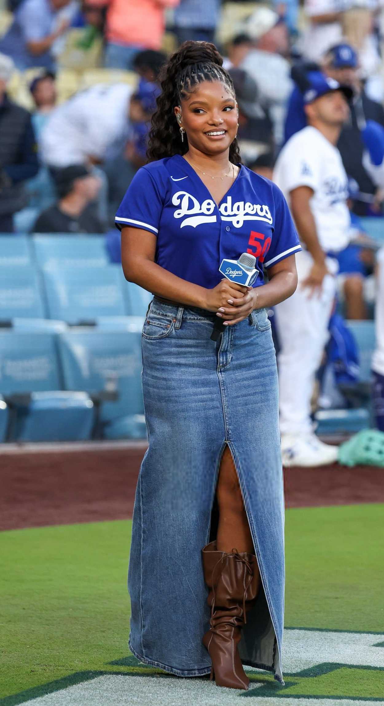 The 25-year-old singer Halle Bailey, who cast as Ariel in the live action film “The Little Mermaid”, performs national anthem at NLCS Game 4 between Los Angeles Dodgers and Milwaukee Brewers in Los Angeles.