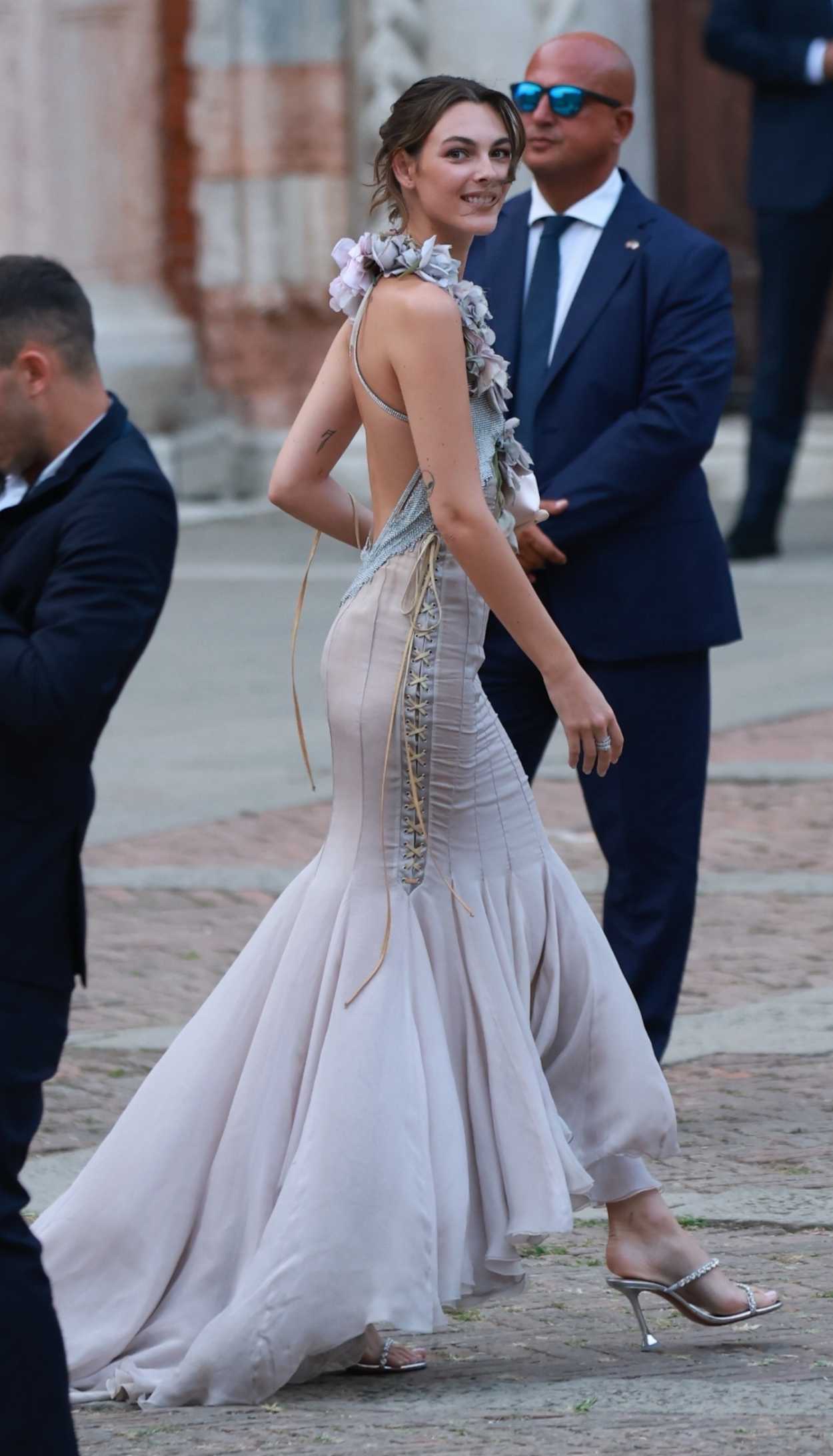 The 26-year-old model Vittoria Ceretti in a beige dress boards a water taxi en route to Jeff Bezos pre-wedding dinner in Venice.
