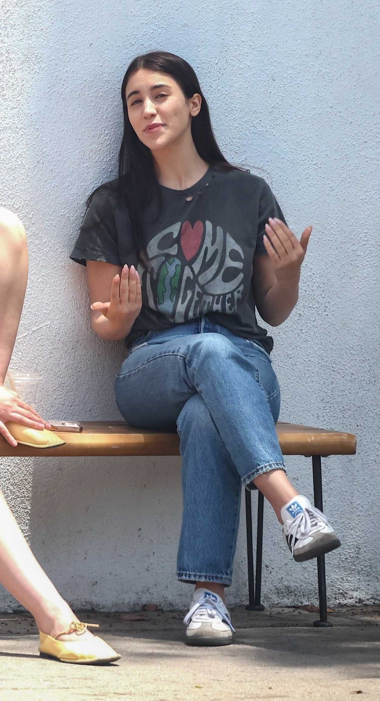 Caylee Cowan in a Black Tee Shares a Laugh During a Chat with a Friend in Los Angeles 06/23/2025 The 27-year-old actress and model Caylee Cowan in a black tee shares a laugh during a chat with a friend in Los Angeles.