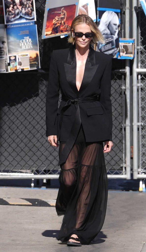 Charlize Theron in a Black Blazer Arrives for Her Guest Appearance on Jimmy Kimmel Live in Hollywood 05/08/2025 The 49-year-old actress Charlize Theron in a black blazer arrives for her guest appearance on “Jimmy Kimmel Live” in Hollywood.