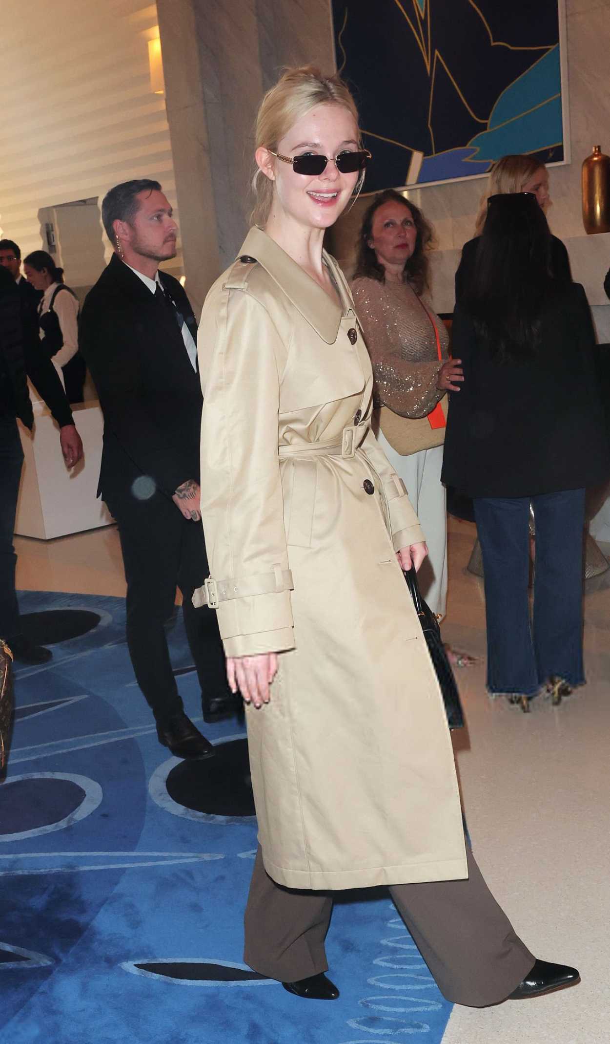 Elle Fanning in a Beige Trench Coat Arrives at the Hotel Martinez in Cannes 05/20/2025
