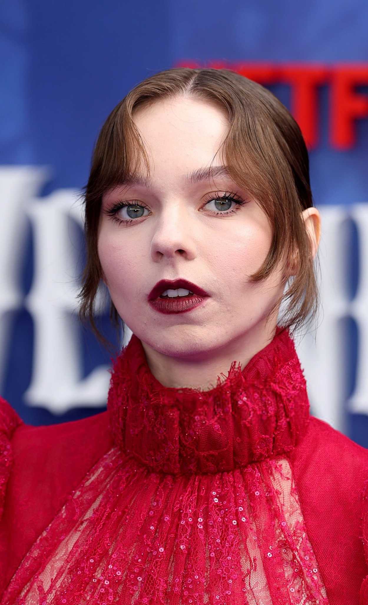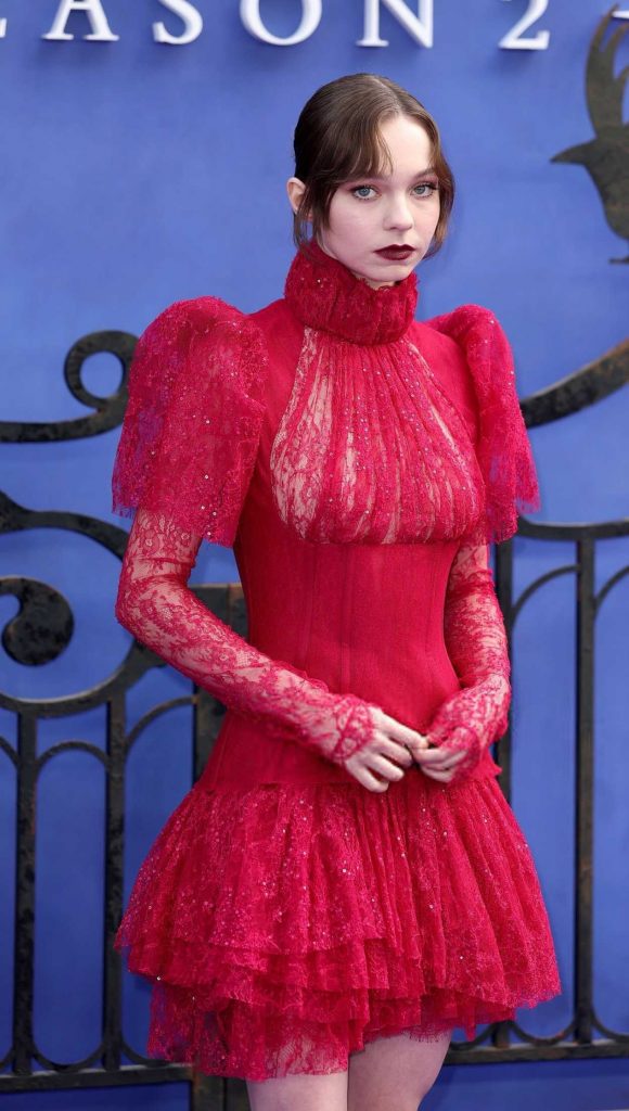 The 23-year-old actress Emma Myers, known for her roles in films including “Girl in the Basement” and the television series “Wednesday”, attends the “Wednesday” season 2 part 1 global premiere in London.