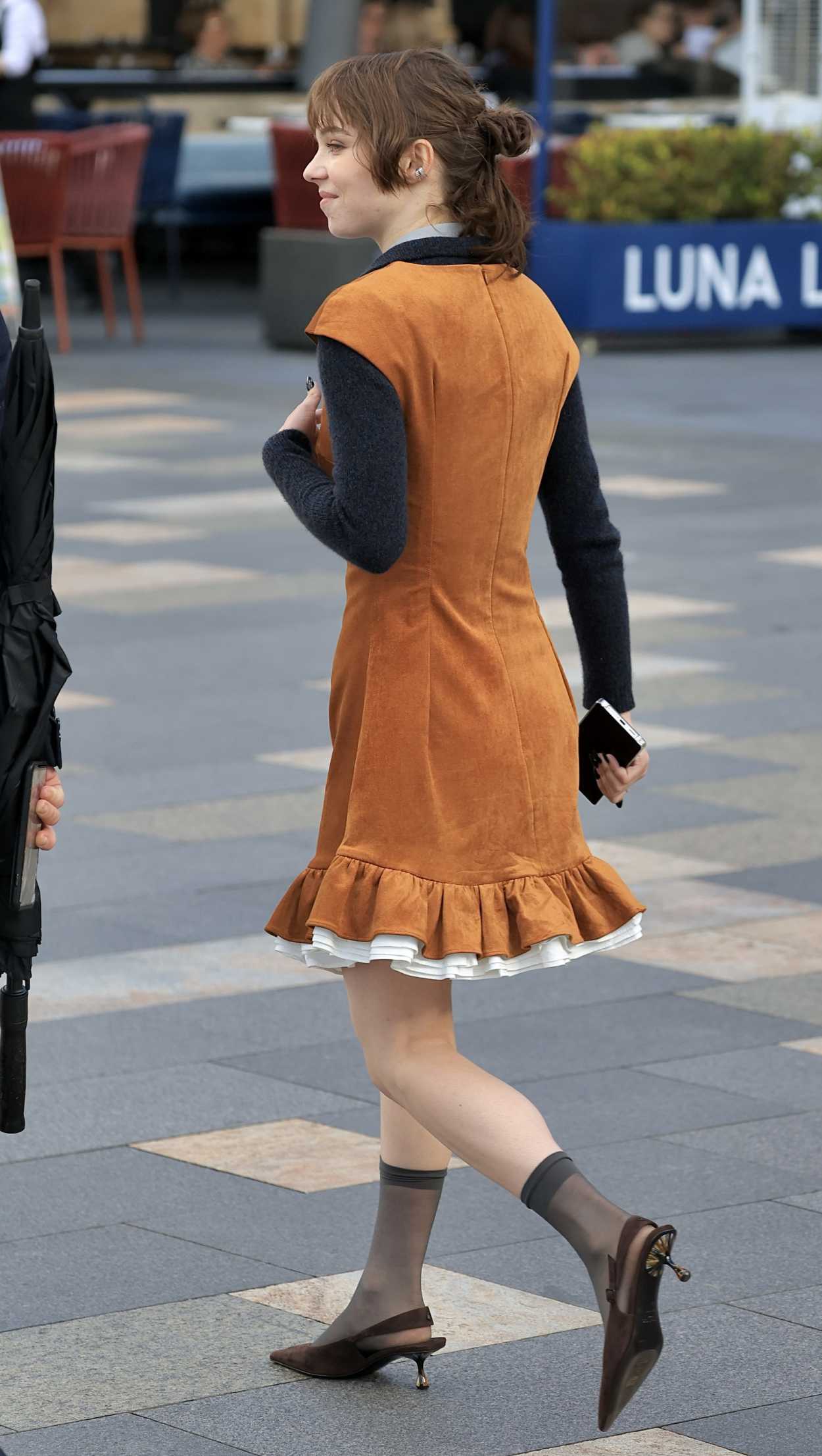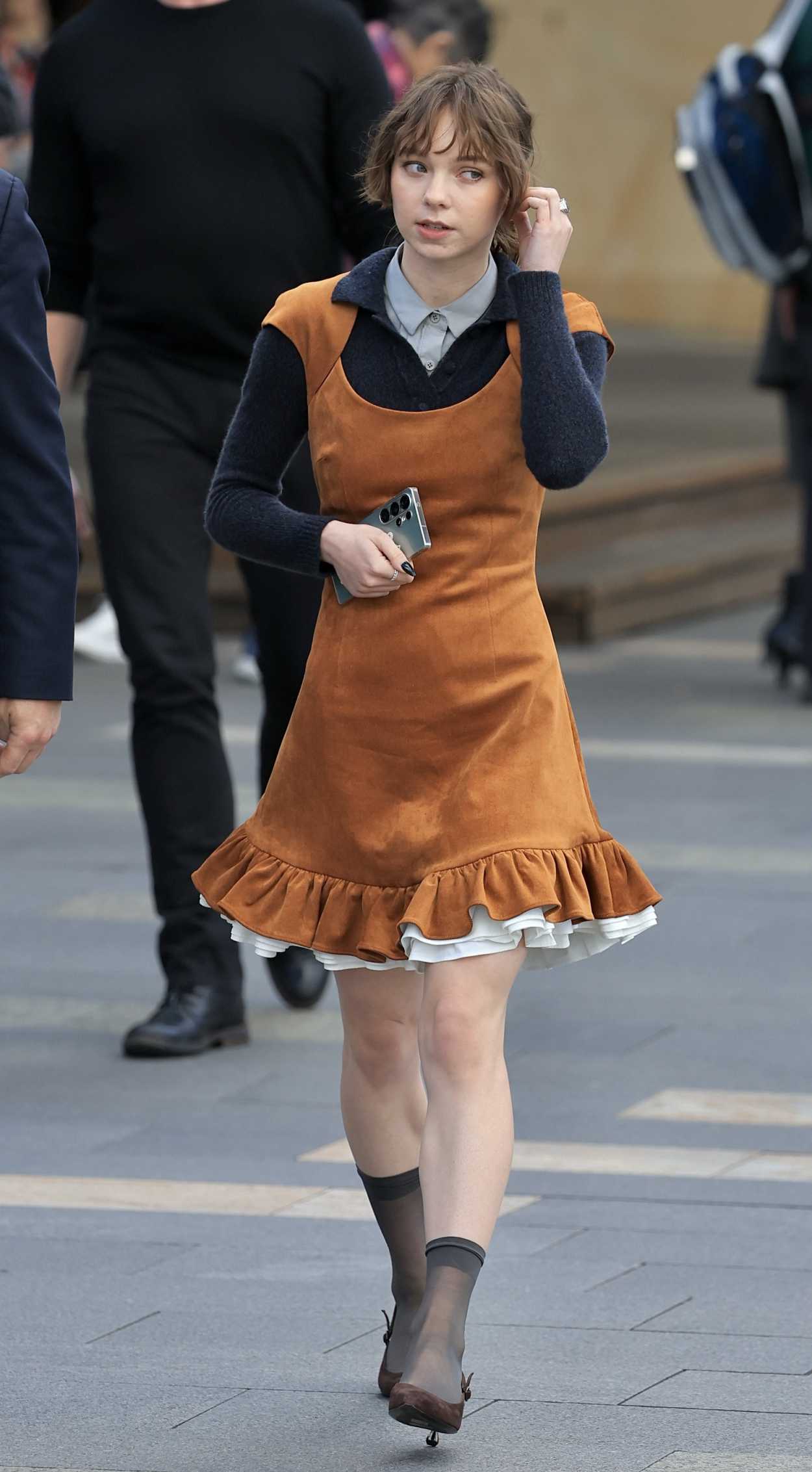 The 23-year-old actress Emma Myers in a tan dress was seen out in Sydney.
