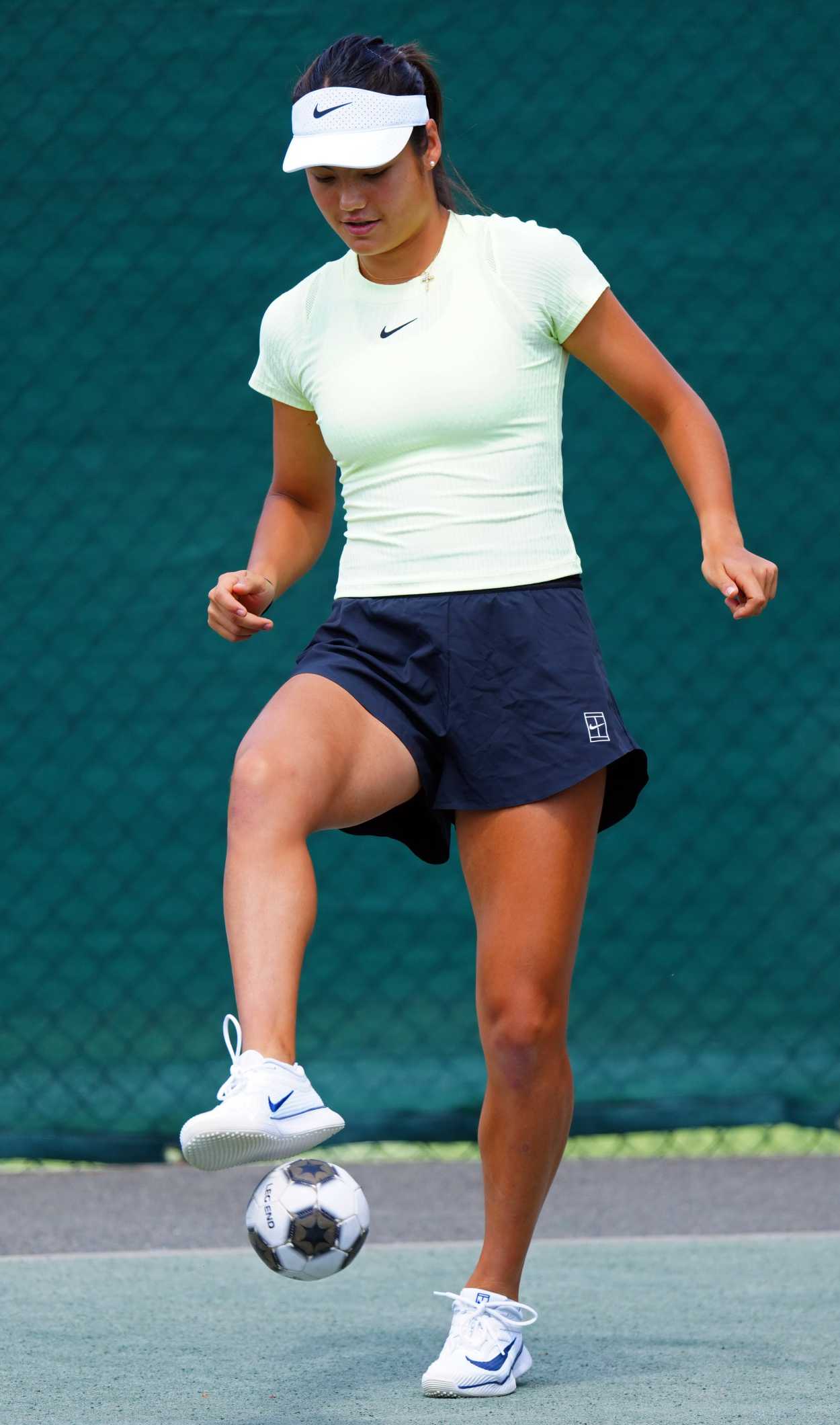 The 22-year-old British tennis player Emma Raducanu, who began playing tennis at the Bromley Tennis Academy when she was five years old, in a navy shorts makes some time for soccer on the practice courts at 2025 Wimbledon in London.