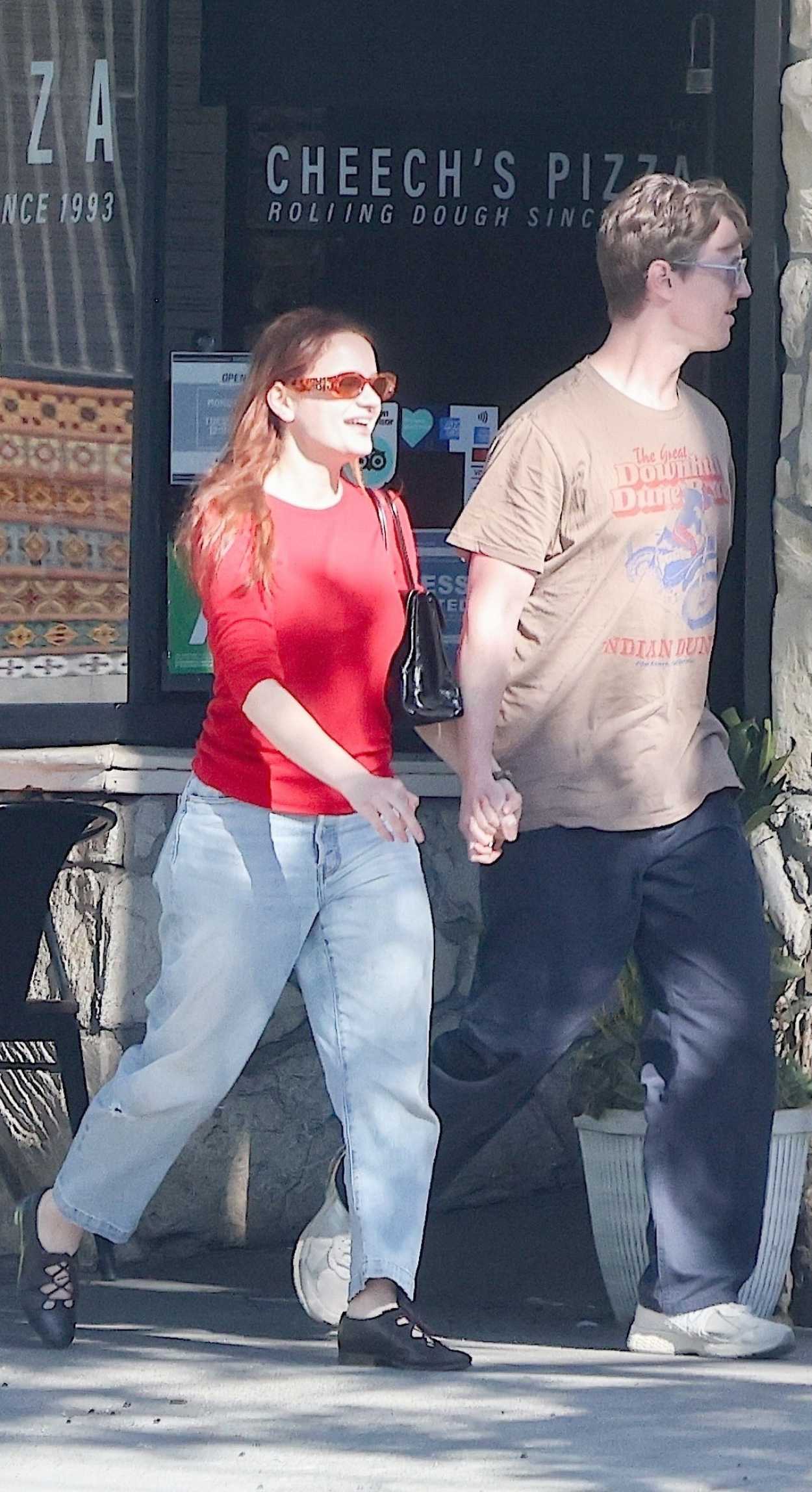 The 26-year-old actress Joey King, who in 2014 began playing the character Greta Grimly on the FX series “Fargo”, in a red long sleeves T-shirt heads to lunch with Steven Piet in Los Angeles.