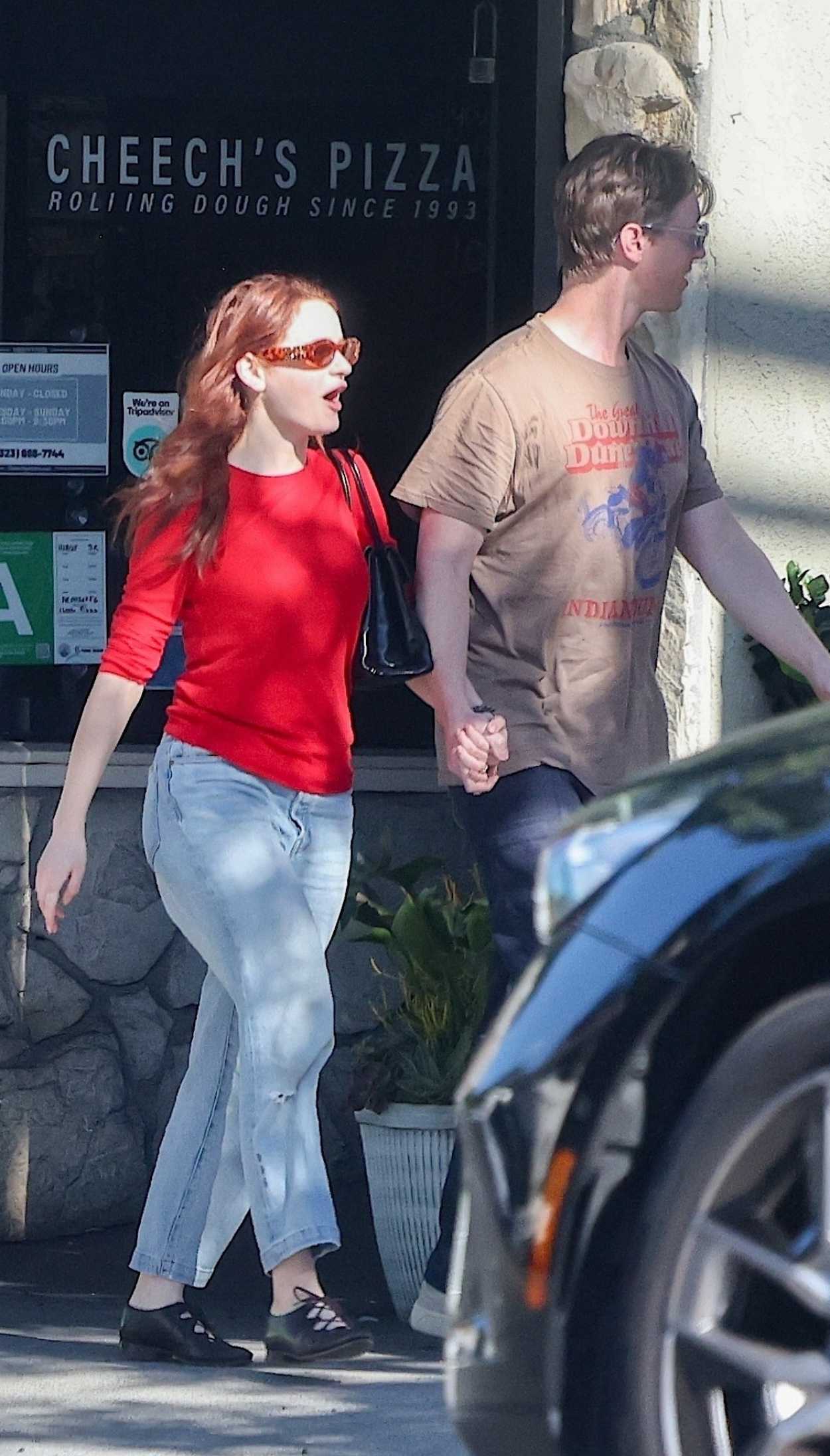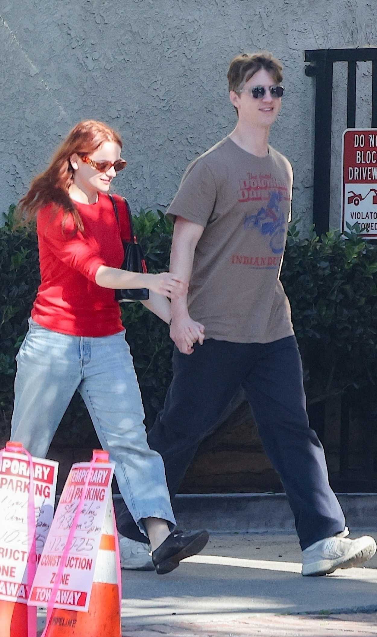 Joey King in a Red Long Sleeves T-Shirt Heads to Lunch with Steven Piet in Los Angeles 12/11/2025