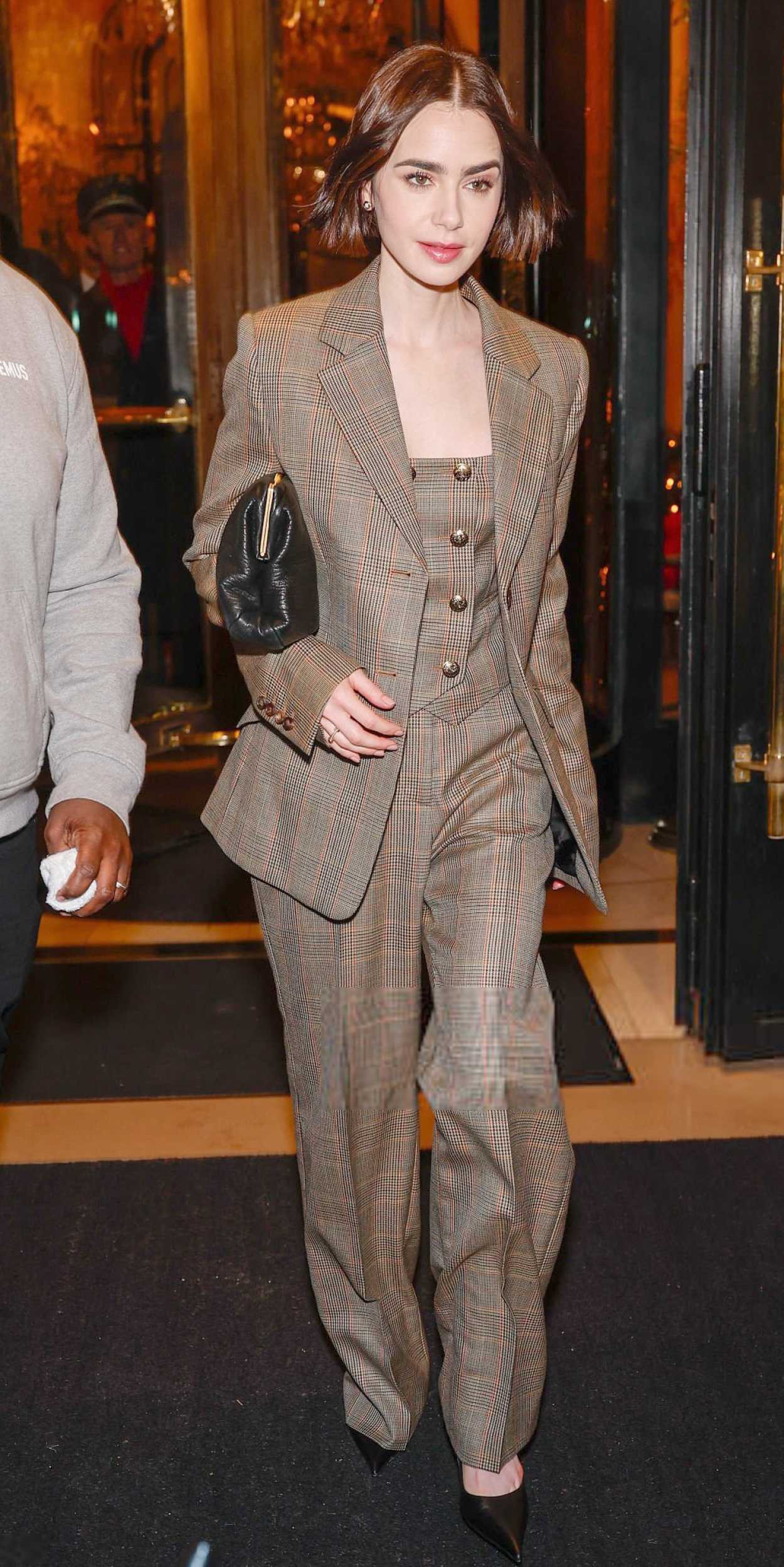 Lily Collins in a Tan Plaid Pantsuit Exiting Her Hotel in Paris 12/14/2025