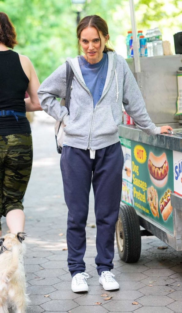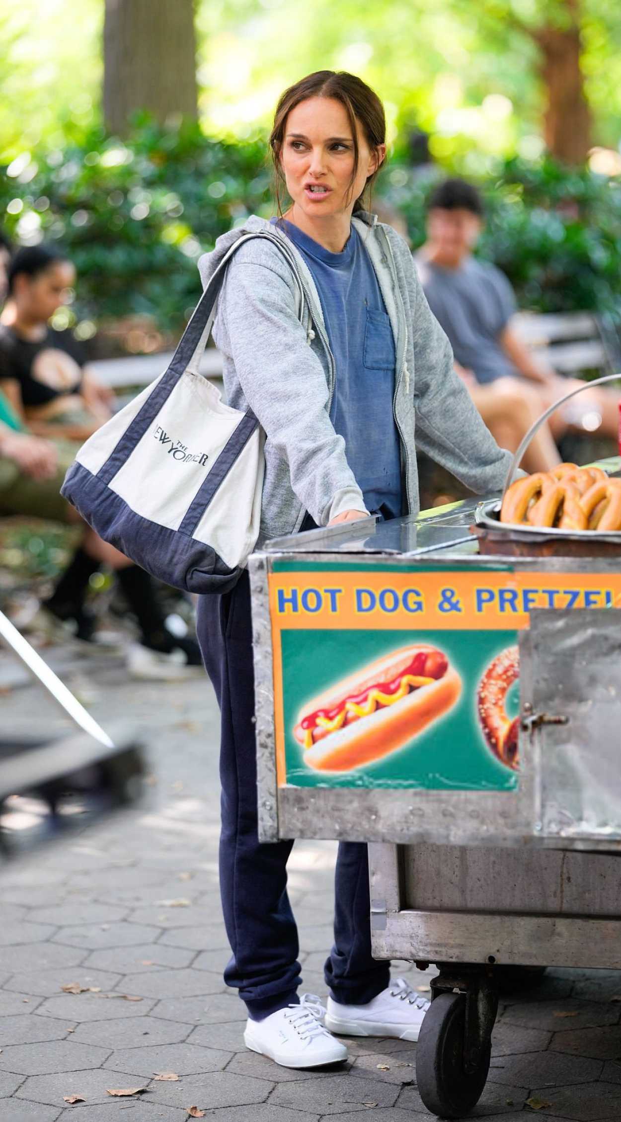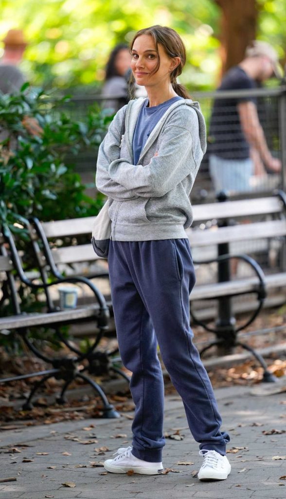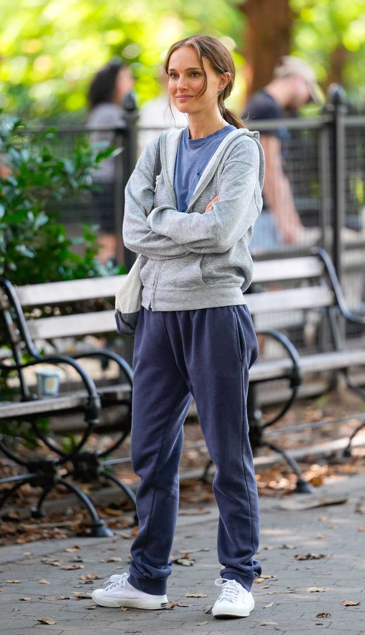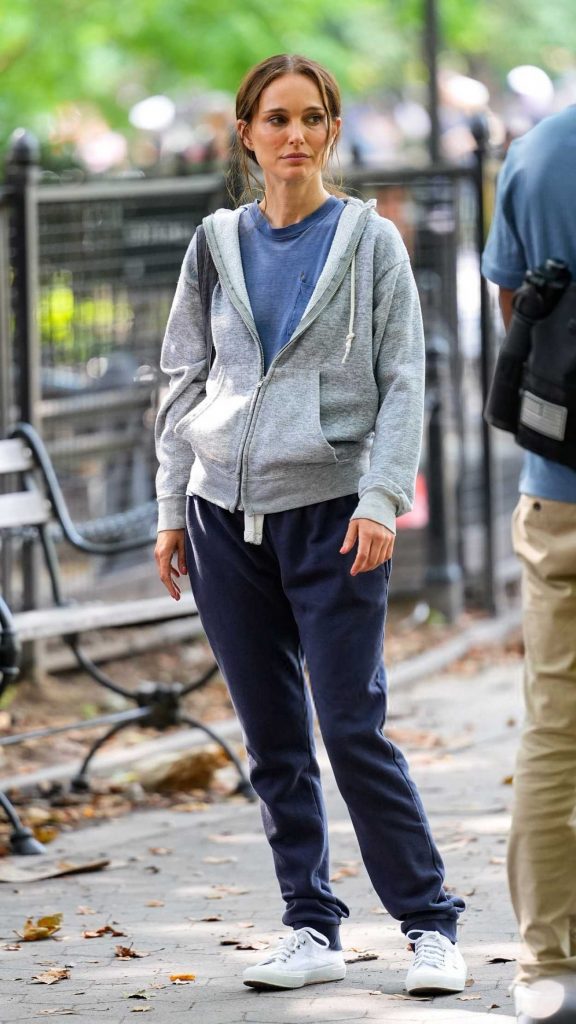 The 44-year-old actress Natalie Portman, who played Queen Amidala in the “Star Wars” prequel trilogy, in a white sneakers filming scenes for “Good Sex” in Washington Square Park in New York City.