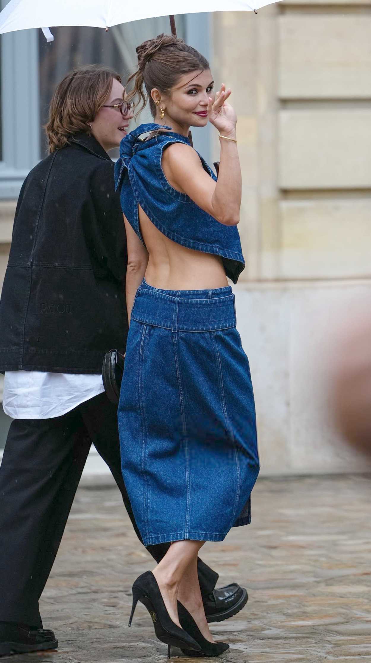 The 25-year-old makeup, hair, fashion, health and confidence YouTuber Olivia Jade in a blue denim ensemble arrives at the Patou Fashion Show during 2025 Paris Fashion Week in Paris.