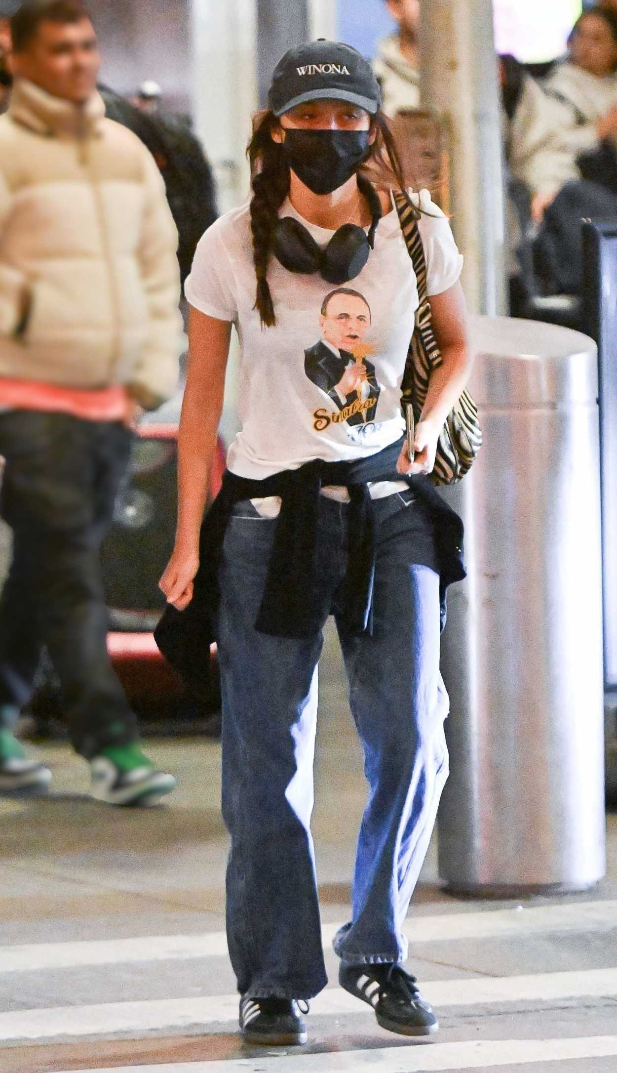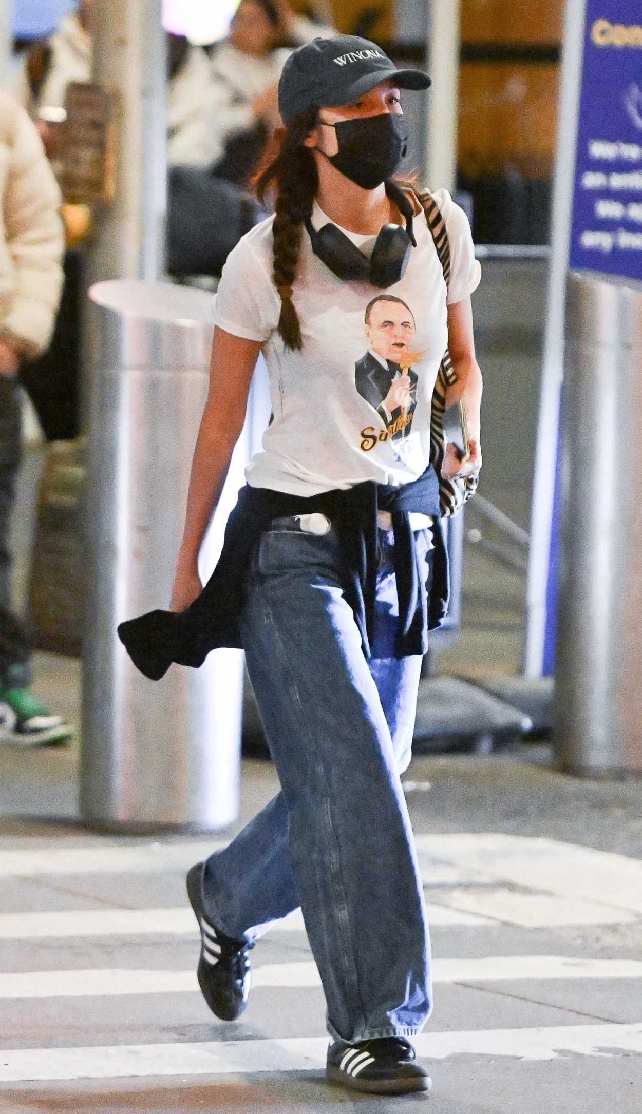The 22-year-old singer and actress Olivia Rodrigo, who became romantically linked to Louis Partridge in 2023, in a black protective mask arrives at JFK International Airport in New York City.
