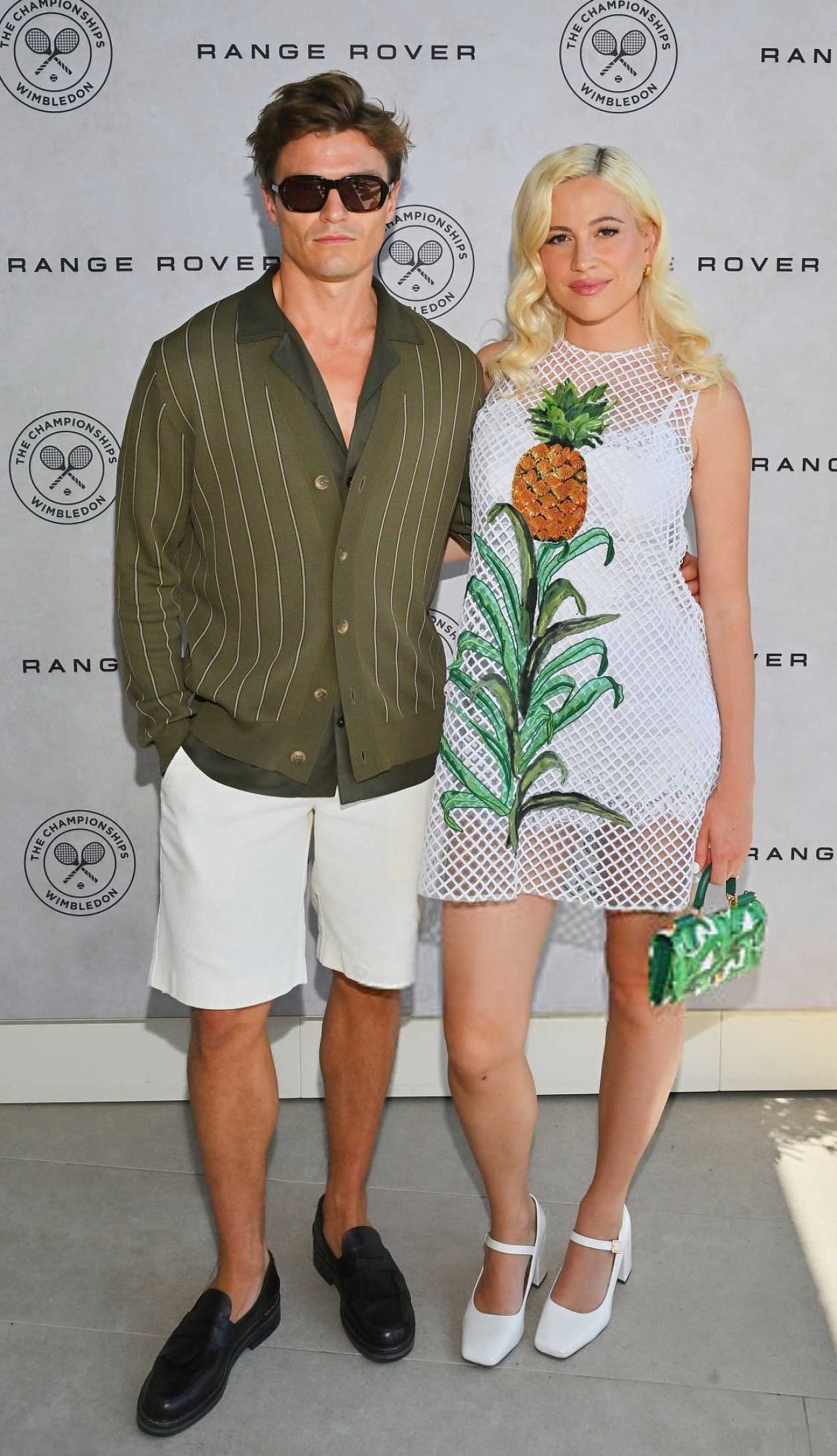 The 34-year-old English singer Pixie Lott, who got married model Oliver Cheshire in the summer of 2022, in a white fishnet dress attends day 13 of 2025 Wimbledon in London.