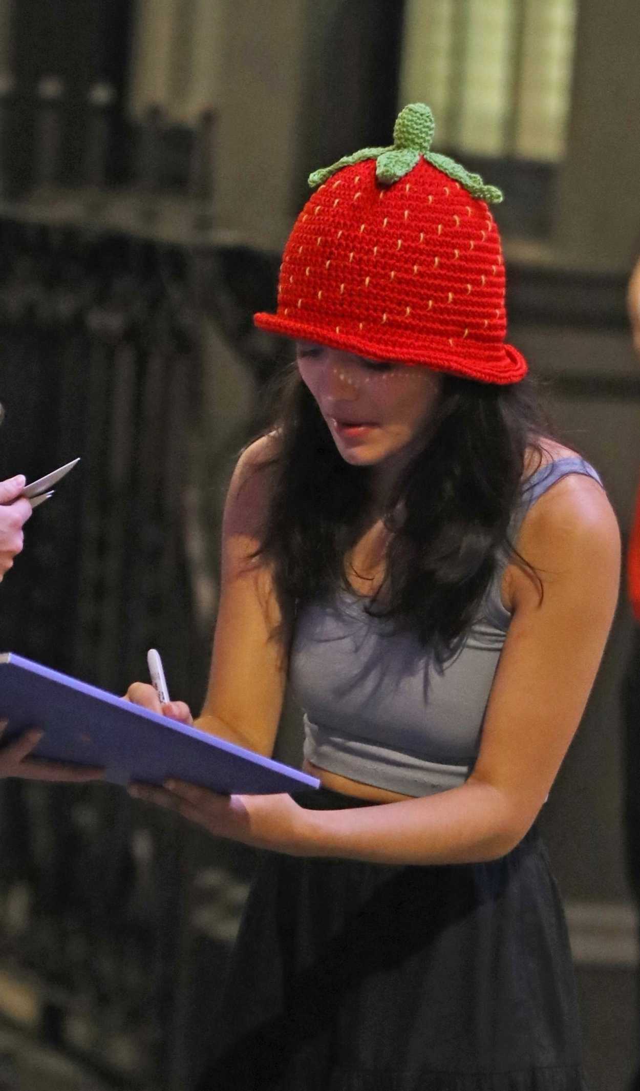 The 24-year-old stage actress Rachel Zegler in a grey top signing autographs for fans outside the London Palladium in London.