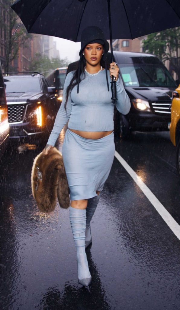 Rihanna in a Baby Blue Ensemble Steps Out in the Rain in New York 05/05/2025