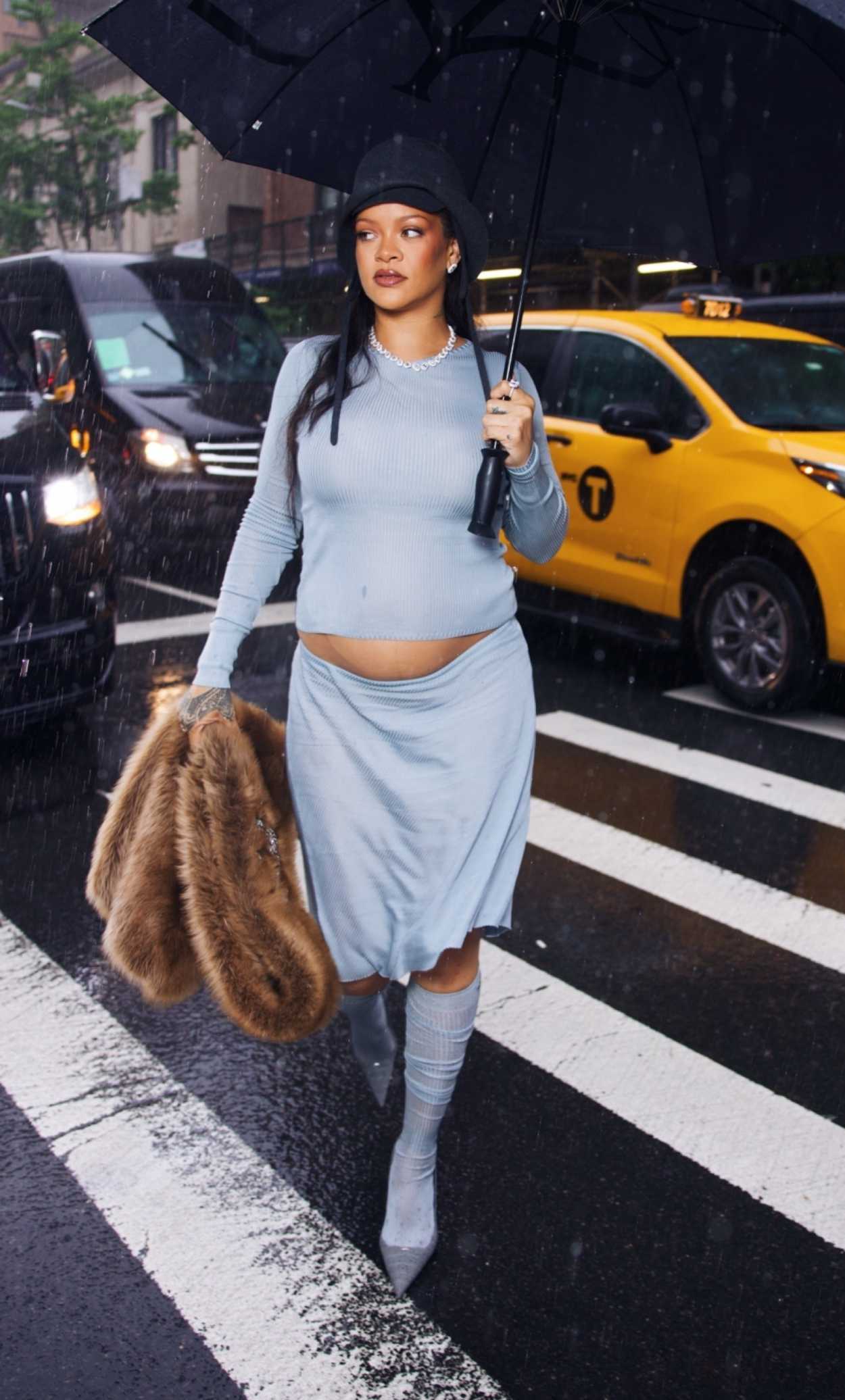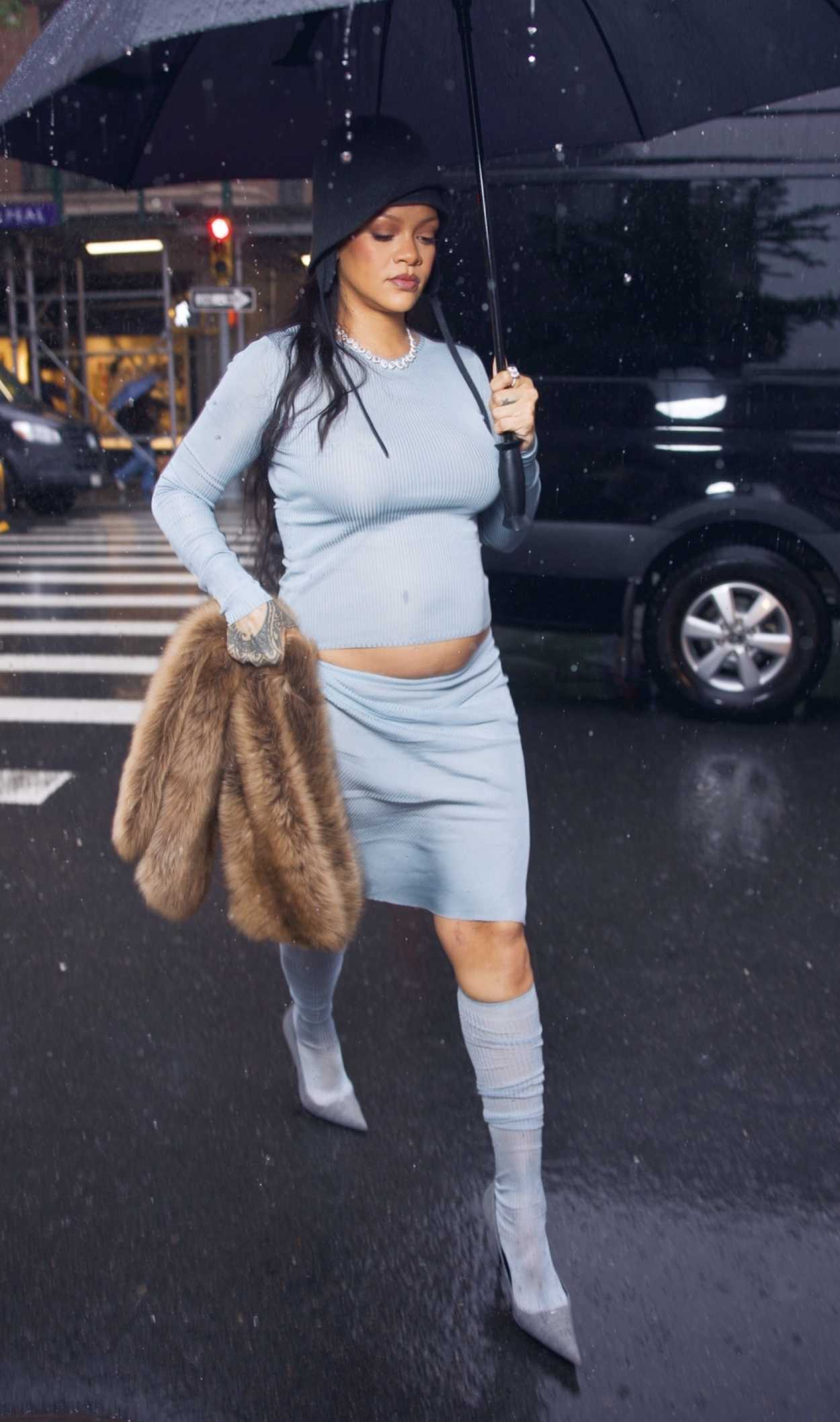 The 37-year-old R&B singer Rihanna in a baby blue ensemble steps out in the rain in New York.