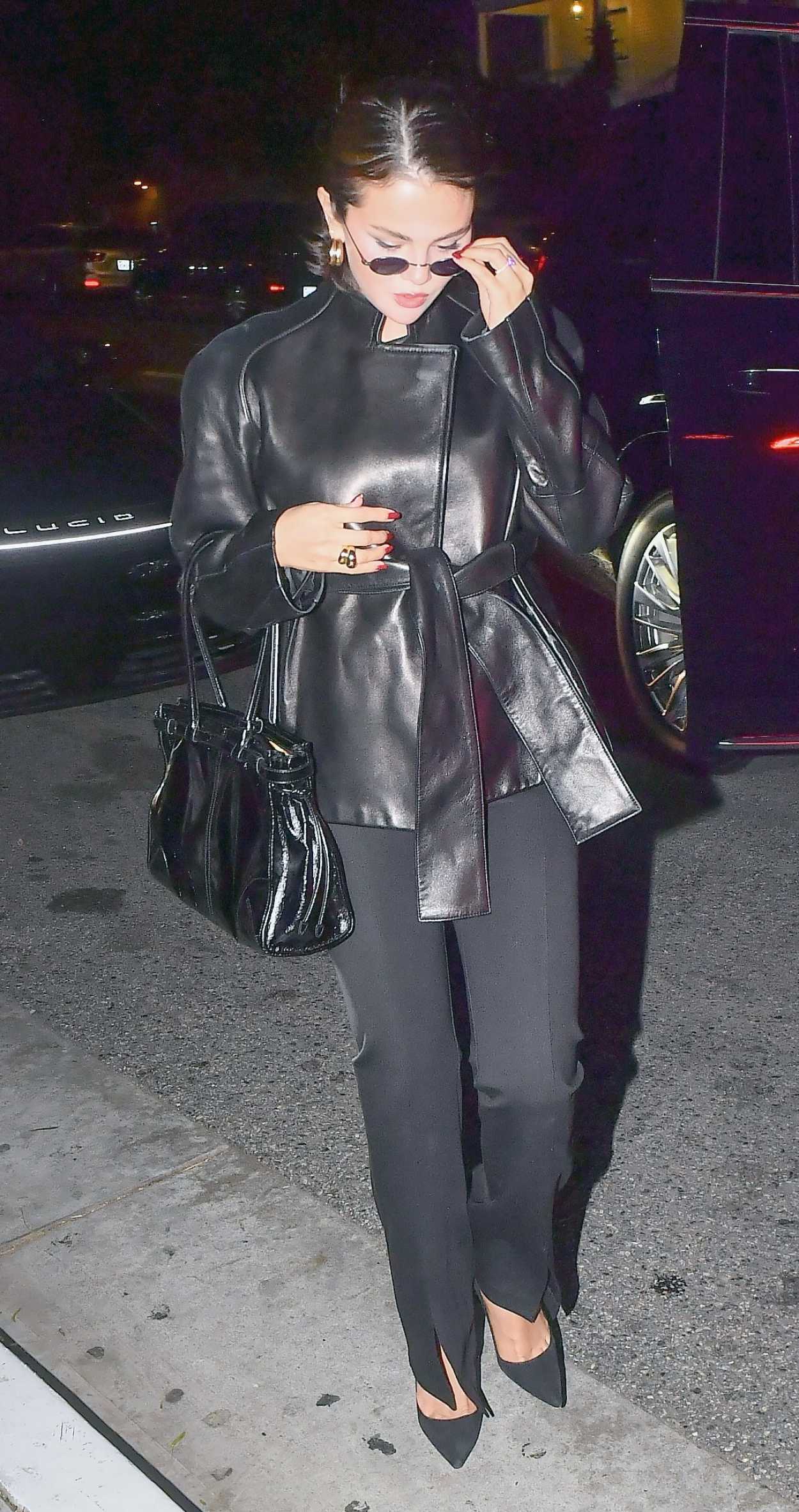 The 33-year-old singer and actress Selena Gomez in a black leather jacket attends Brooks Nader’s birthday dinner at San Vicente Bungalows in West Hollywood.
