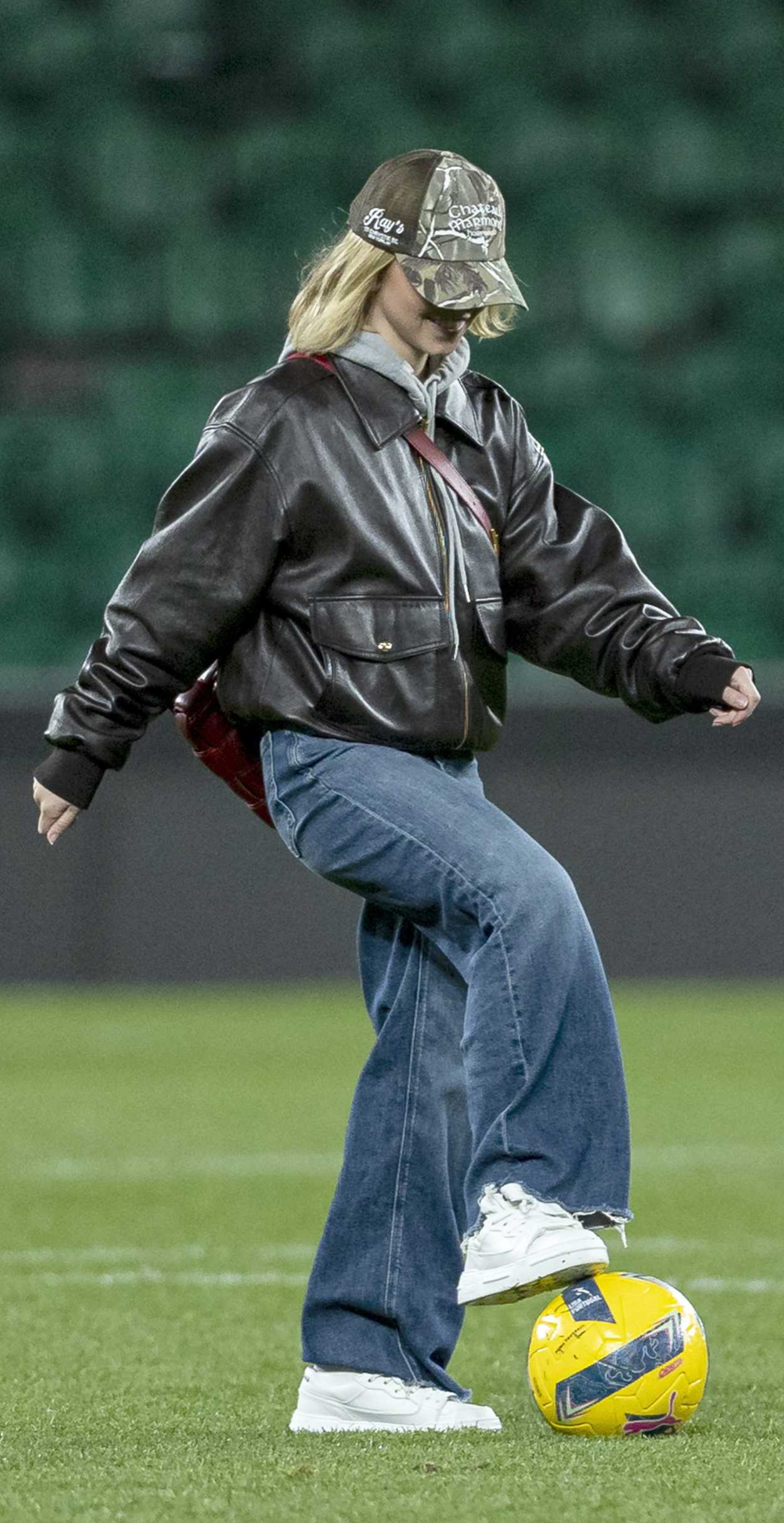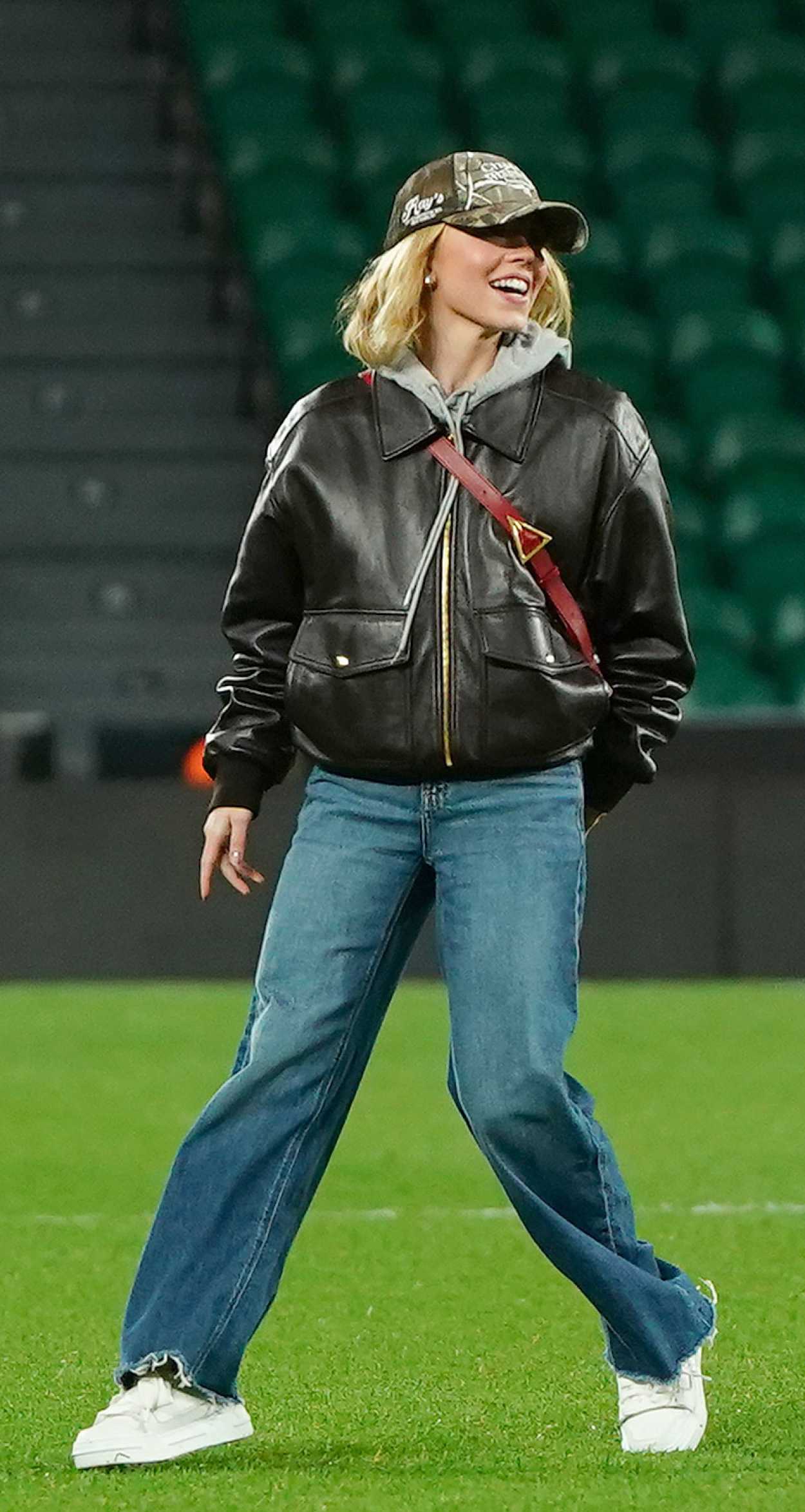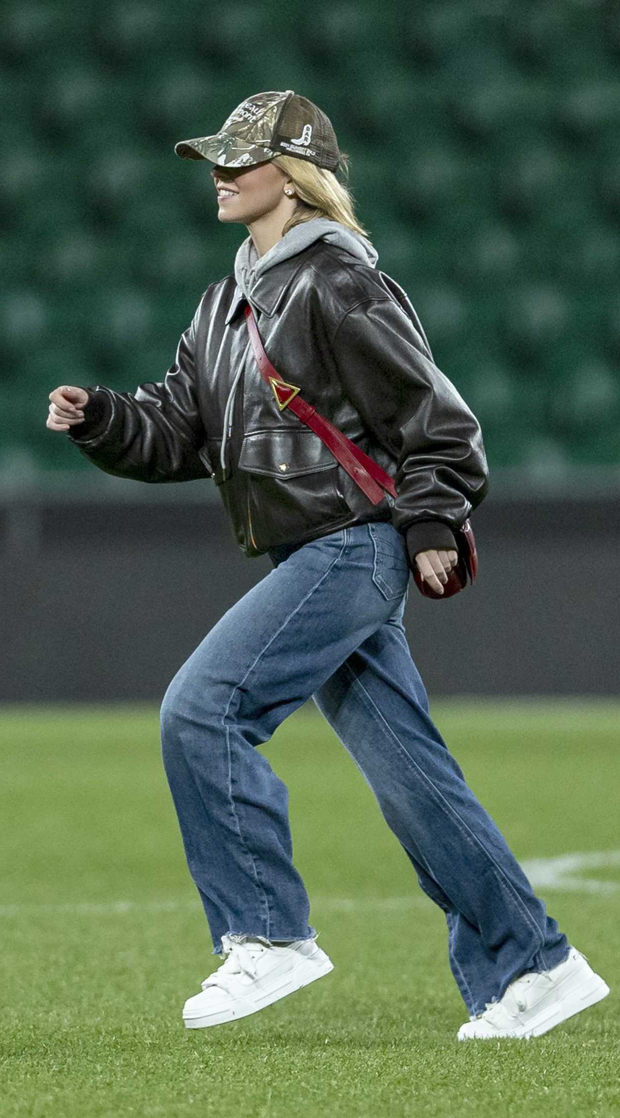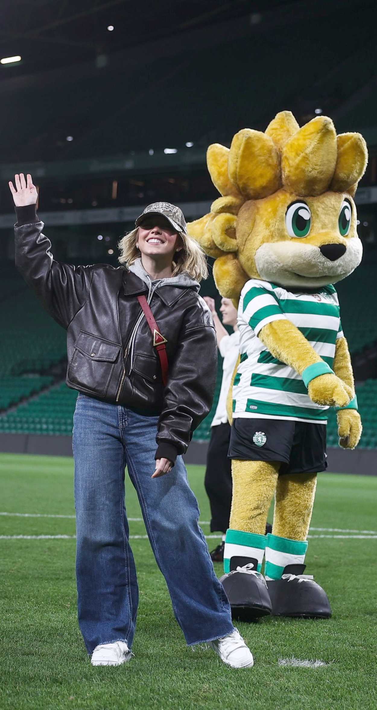 The 28-year-old actress Sydney Sweeney, who won Best Actress honors for her role in “Takeo” at the New York International Film Festival, in a black leather jacket attends Sporting CP v GD Estoril Praia at Estadio Jose Alvalade in Lisbon.