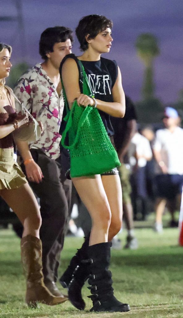 The 29-year-old model Taylor Marie Hill, who in 2014, was one of the faces of the brand Rosa Cha, in a black tee attends day 2 of 2025 Coachella Valley Music and Arts Festival in Indio.