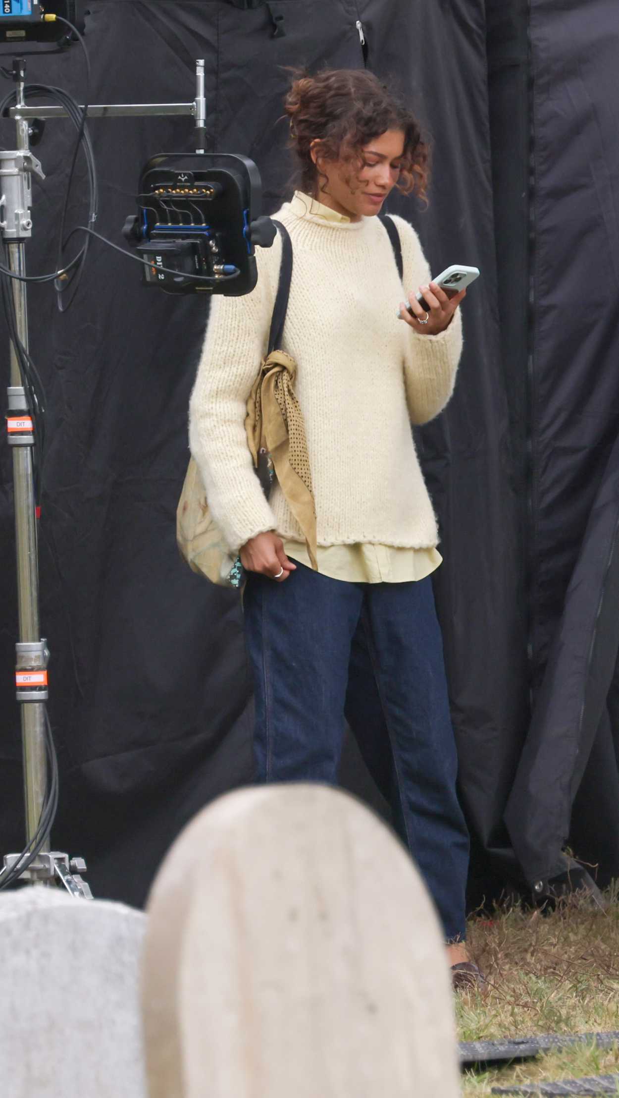 The 28-year-old actress and singer Zendaya Coleman in a beige sweater visits the set as Tom Holland films scenes for “Spider-Man: Brand New Day” in London.